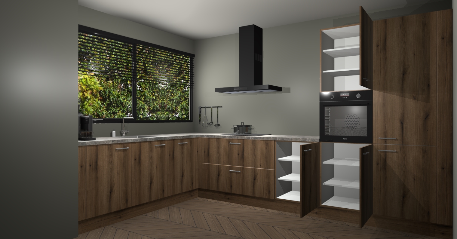 Met een modern, tijdloos design en ruime opslagruimte, zult u zich in no-time thuis voelen in uw nieuwe keuken. Uw leven wordt eenvoudiger met de soft-close deuren die voor het ultieme stille comfort zorgen - geen geluid dat u stoort terwijl u kookt. Ook is de keuken voorzien van 5 ingebouwde apparaten: een oven, inductie kookplaat, afzuigkap, vaatwasser en koelkast. Deze kunnen gemakkelijk na bestelling worden bijgewerkt naar AEG - waardoor uw luxe ervaring compleet is.