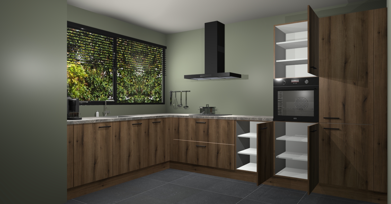 Met een modern, tijdloos design en ruime opslagruimte, zult u zich in no-time thuis voelen in uw nieuwe keuken. Uw leven wordt eenvoudiger met de soft-close deuren die voor het ultieme stille comfort zorgen - geen geluid dat u stoort terwijl u kookt. Ook is de keuken voorzien van 5 ingebouwde apparaten: een oven, inductie kookplaat, afzuigkap, vaatwasser en koelkast. Deze kunnen gemakkelijk na bestelling worden bijgewerkt naar AEG - waardoor uw luxe ervaring compleet is.