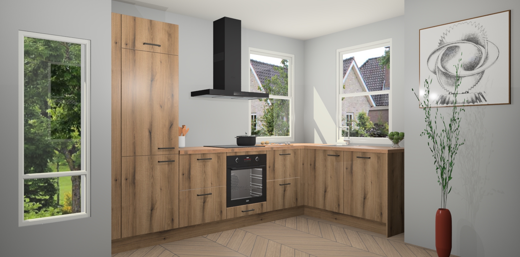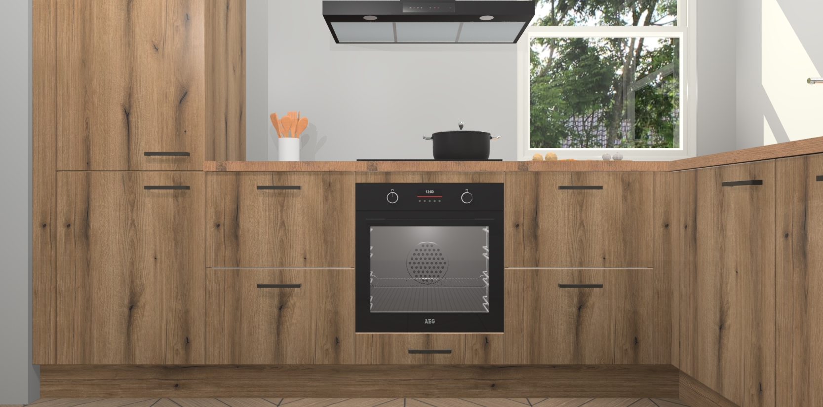 Wat maakt deze keuken zo bijzonder? Ten eerste geeft het houten werkblad uw ruimte een onmiskenbaar klassieke uitstraling. De natuurlijke afwerking roept warmte en elegantie op die nooit uit de mode zullen raken. Bovendien is het gemakkelijk schoon te houden en te onderhouden, zodat je er jarenlang plezier van kunt hebben. Als u op zoek bent naar extra gemak in uw keuken, dan heeft u bij het plaatsen van een bestelling bij ons ook de optie om uw toestellen te upgraden naar AEG-modellen - zo haalt u moderne innovatie van topmerken in apparatentechnologie rechtstreeks in huis.