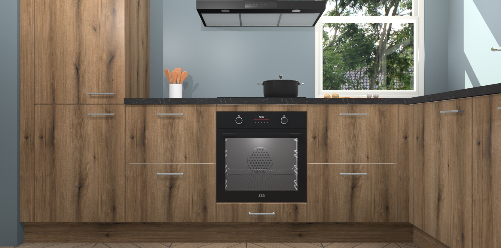 Wat maakt deze keuken zo bijzonder? Ten eerste geeft het houten werkblad uw ruimte een onmiskenbaar klassieke uitstraling. De natuurlijke afwerking roept warmte en elegantie op die nooit uit de mode zullen raken. Bovendien is het gemakkelijk schoon te houden en te onderhouden, zodat je er jarenlang plezier van kunt hebben. Als u op zoek bent naar extra gemak in uw keuken, dan heeft u bij het plaatsen van een bestelling bij ons ook de optie om uw toestellen te upgraden naar AEG-modellen - zo haalt u moderne innovatie van topmerken in apparatentechnologie rechtstreeks in huis.