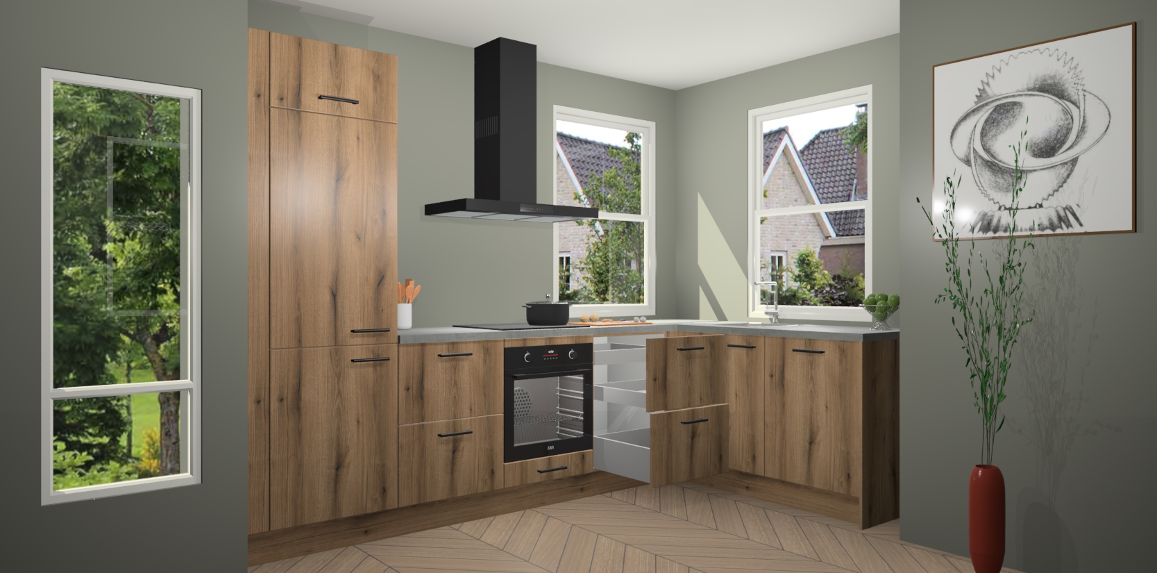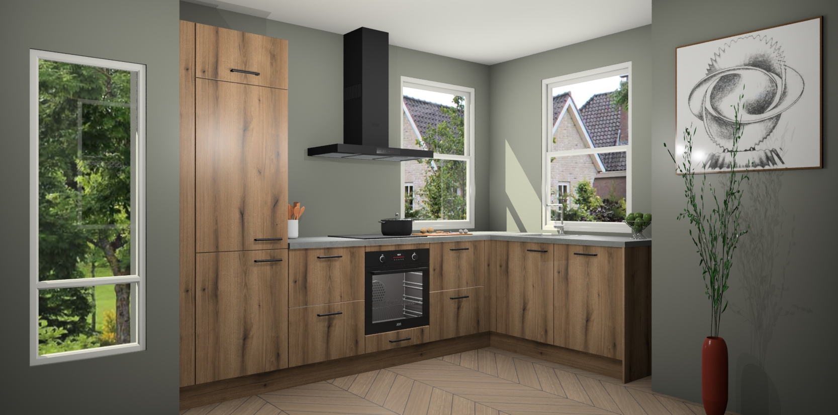 Wat maakt deze keuken zo bijzonder? Ten eerste geeft het houten werkblad uw ruimte een onmiskenbaar klassieke uitstraling. De natuurlijke afwerking roept warmte en elegantie op die nooit uit de mode zullen raken. Bovendien is het gemakkelijk schoon te houden en te onderhouden, zodat je er jarenlang plezier van kunt hebben. Als u op zoek bent naar extra gemak in uw keuken, dan heeft u bij het plaatsen van een bestelling bij ons ook de optie om uw toestellen te upgraden naar AEG-modellen - zo haalt u moderne innovatie van topmerken in apparatentechnologie rechtstreeks in huis.