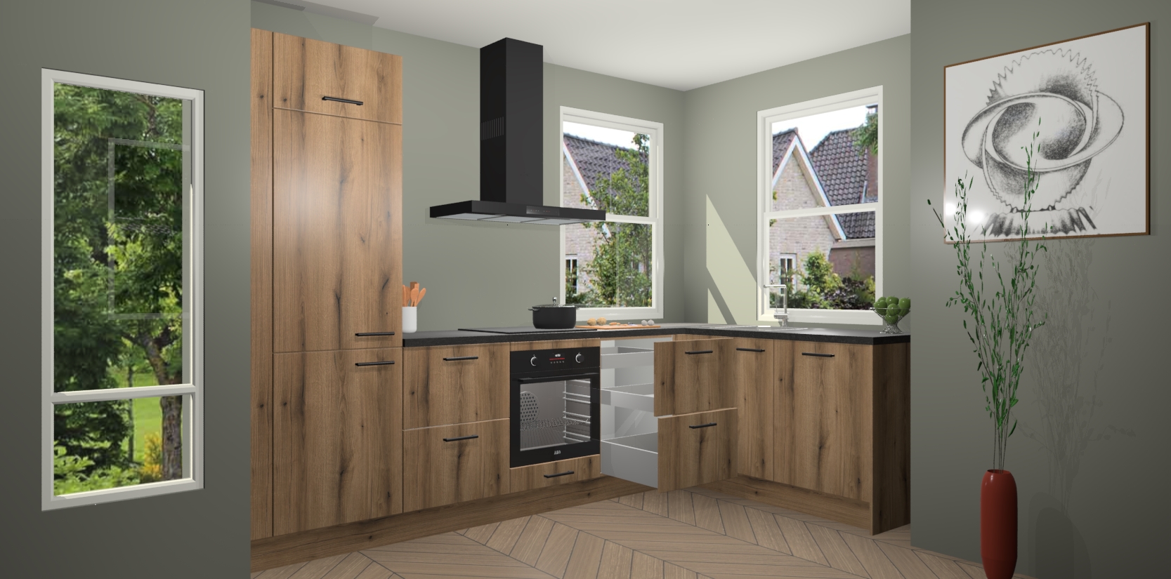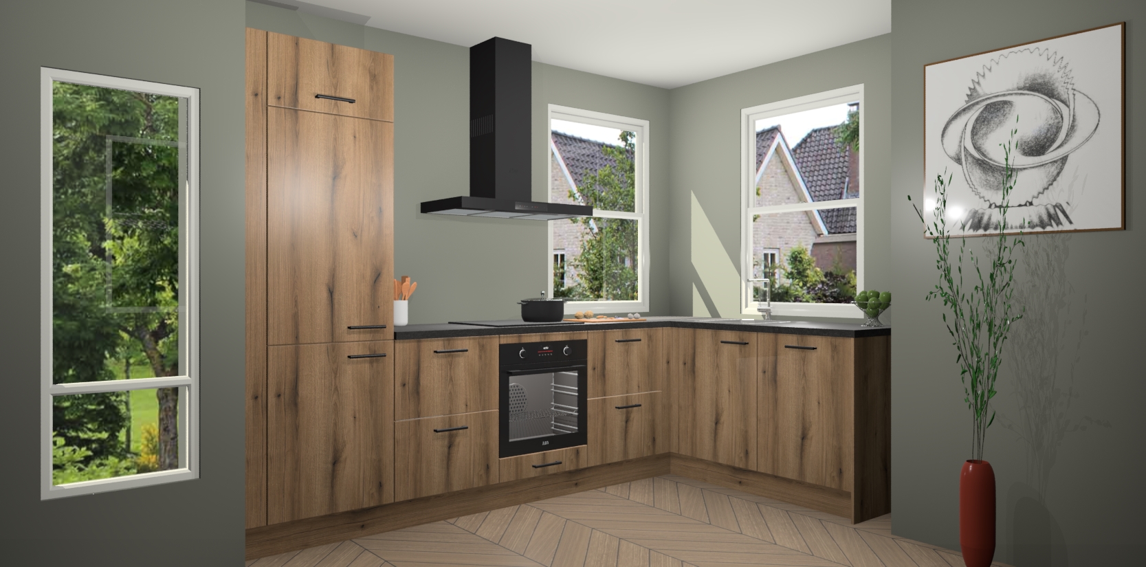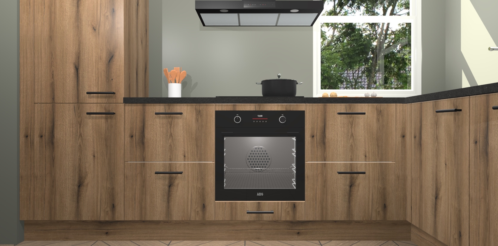 Wat maakt deze keuken zo bijzonder? Ten eerste geeft het houten werkblad uw ruimte een onmiskenbaar klassieke uitstraling. De natuurlijke afwerking roept warmte en elegantie op die nooit uit de mode zullen raken. Bovendien is het gemakkelijk schoon te houden en te onderhouden, zodat je er jarenlang plezier van kunt hebben. Als u op zoek bent naar extra gemak in uw keuken, dan heeft u bij het plaatsen van een bestelling bij ons ook de optie om uw toestellen te upgraden naar AEG-modellen - zo haalt u moderne innovatie van topmerken in apparatentechnologie rechtstreeks in huis.