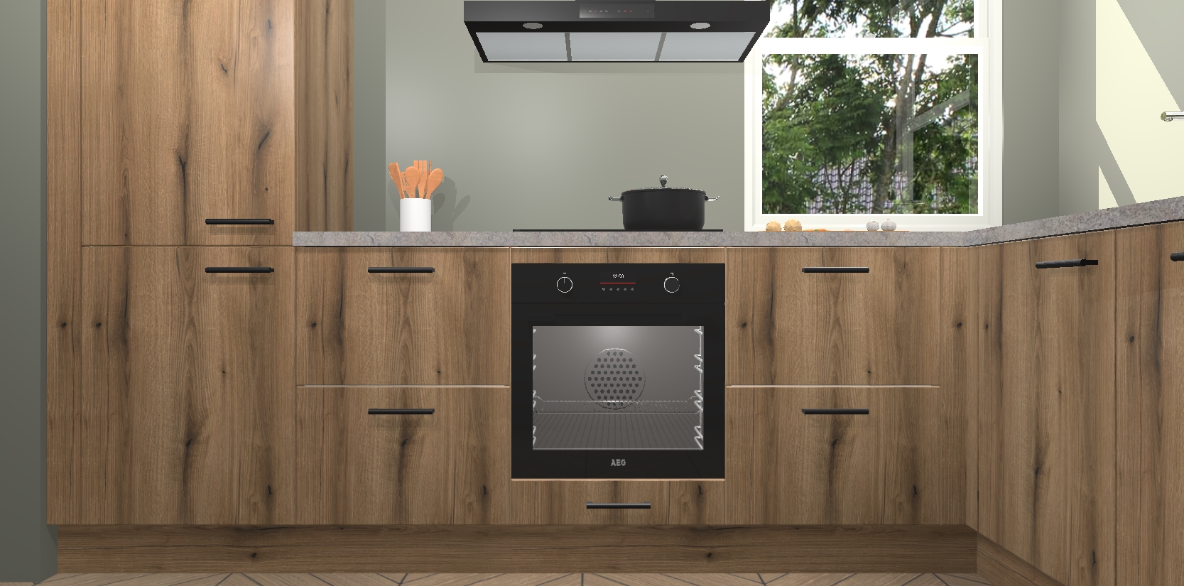 Wat maakt deze keuken zo bijzonder? Ten eerste geeft het houten werkblad uw ruimte een onmiskenbaar klassieke uitstraling. De natuurlijke afwerking roept warmte en elegantie op die nooit uit de mode zullen raken. Bovendien is het gemakkelijk schoon te houden en te onderhouden, zodat je er jarenlang plezier van kunt hebben. Als u op zoek bent naar extra gemak in uw keuken, dan heeft u bij het plaatsen van een bestelling bij ons ook de optie om uw toestellen te upgraden naar AEG-modellen - zo haalt u moderne innovatie van topmerken in apparatentechnologie rechtstreeks in huis.
