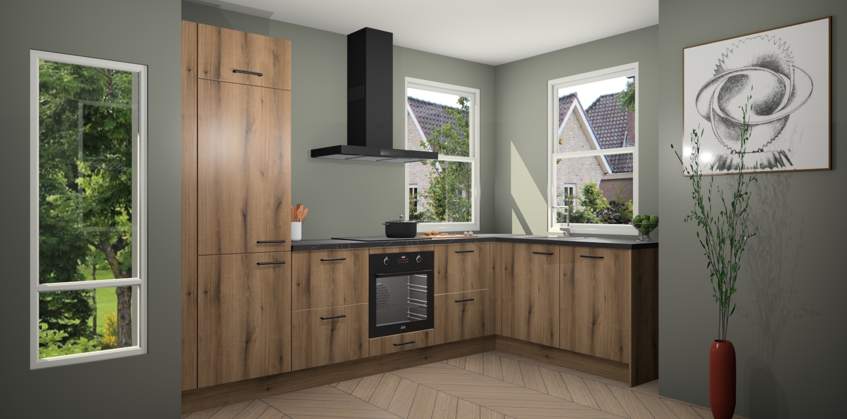 Wat maakt deze keuken zo bijzonder? Ten eerste geeft het houten werkblad uw ruimte een onmiskenbaar klassieke uitstraling. De natuurlijke afwerking roept warmte en elegantie op die nooit uit de mode zullen raken. Bovendien is het gemakkelijk schoon te houden en te onderhouden, zodat je er jarenlang plezier van kunt hebben. Als u op zoek bent naar extra gemak in uw keuken, dan heeft u bij het plaatsen van een bestelling bij ons ook de optie om uw toestellen te upgraden naar AEG-modellen - zo haalt u moderne innovatie van topmerken in apparatentechnologie rechtstreeks in huis.