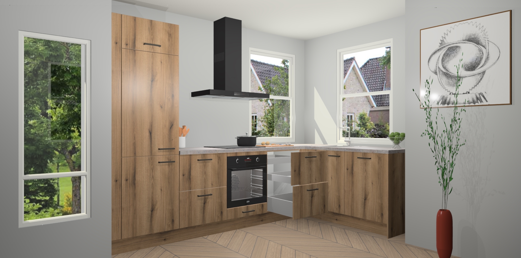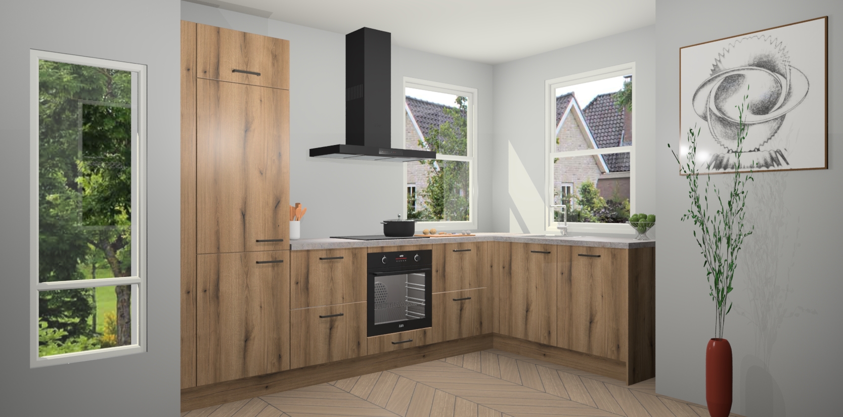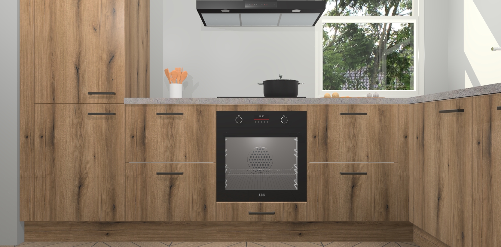 Wat maakt deze keuken zo bijzonder? Ten eerste geeft het houten werkblad uw ruimte een onmiskenbaar klassieke uitstraling. De natuurlijke afwerking roept warmte en elegantie op die nooit uit de mode zullen raken. Bovendien is het gemakkelijk schoon te houden en te onderhouden, zodat je er jarenlang plezier van kunt hebben. Als u op zoek bent naar extra gemak in uw keuken, dan heeft u bij het plaatsen van een bestelling bij ons ook de optie om uw toestellen te upgraden naar AEG-modellen - zo haalt u moderne innovatie van topmerken in apparatentechnologie rechtstreeks in huis.