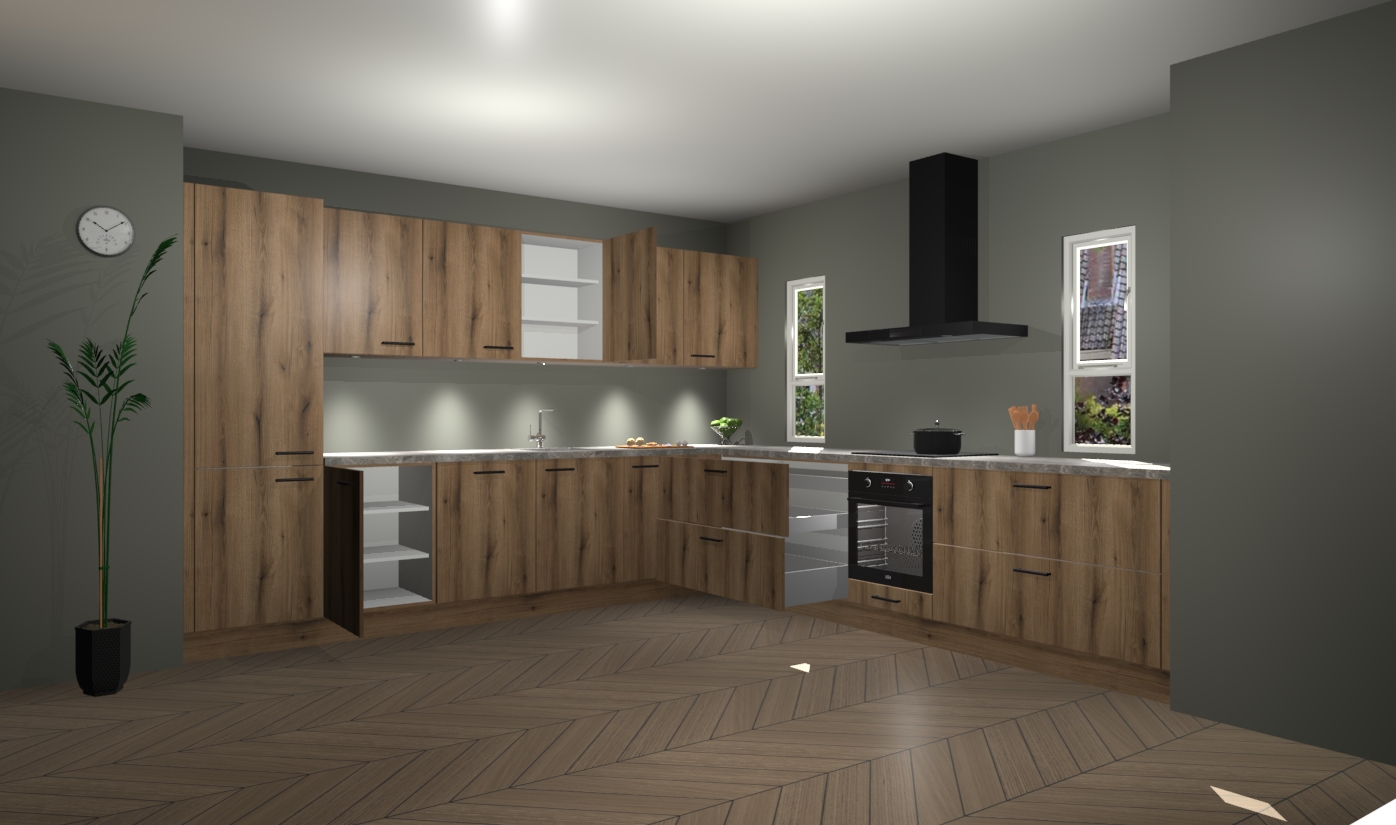 De goud eiken keuken is een ideale hoekkeuken en heeft alle functies en apparatuur die u maar nodig kunt hebben. Bij de bestelling krijgt u een oven, inductiekookplaat, afzuigkap, vaatwasser en koelkast - deze kunnen desgewenst eenvoudig worden uitgebreid naar AEG na bestellen. Elke kast wordt ook voor gemonteerd geleverd met soft close deuren die jarenlang gebruik beloven. Stelt u zich voor dat u geen gedoe heeft met vervelende montage - vanaf het moment dat u uw bestelling plaats, duurt het slechts 7 weken voor het bij u thuis geleverd wordt.