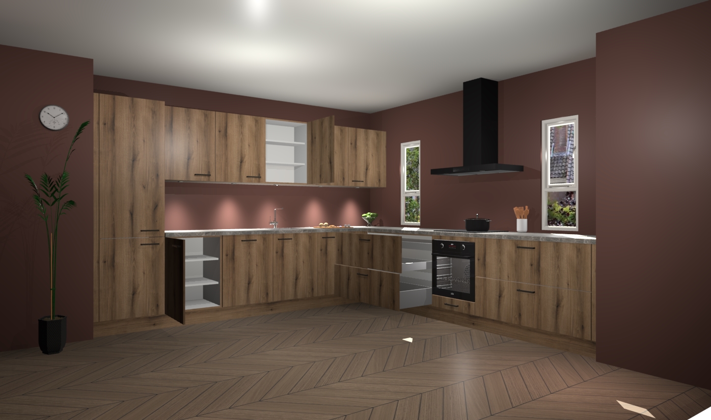 De goud eiken keuken is een ideale hoekkeuken en heeft alle functies en apparatuur die u maar nodig kunt hebben. Bij de bestelling krijgt u een oven, inductiekookplaat, afzuigkap, vaatwasser en koelkast - deze kunnen desgewenst eenvoudig worden uitgebreid naar AEG na bestellen. Elke kast wordt ook voor gemonteerd geleverd met soft close deuren die jarenlang gebruik beloven. Stelt u zich voor dat u geen gedoe heeft met vervelende montage - vanaf het moment dat u uw bestelling plaats, duurt het slechts 7 weken voor het bij u thuis geleverd wordt.