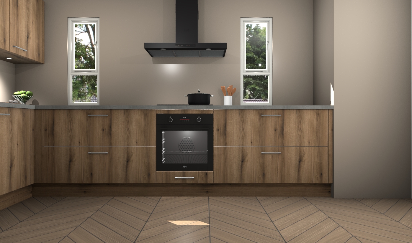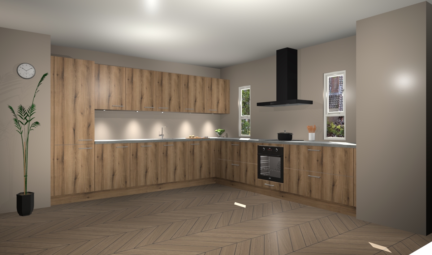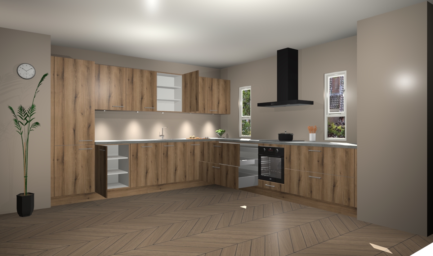 De goud eiken keuken is een ideale hoekkeuken en heeft alle functies en apparatuur die u maar nodig kunt hebben. Bij de bestelling krijgt u een oven, inductiekookplaat, afzuigkap, vaatwasser en koelkast - deze kunnen desgewenst eenvoudig worden uitgebreid naar AEG na bestellen. Elke kast wordt ook voor gemonteerd geleverd met soft close deuren die jarenlang gebruik beloven. Stelt u zich voor dat u geen gedoe heeft met vervelende montage - vanaf het moment dat u uw bestelling plaats, duurt het slechts 7 weken voor het bij u thuis geleverd wordt.