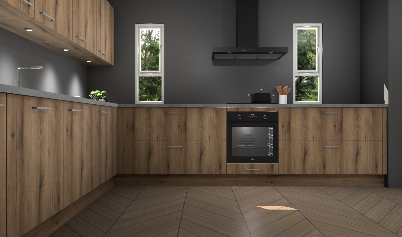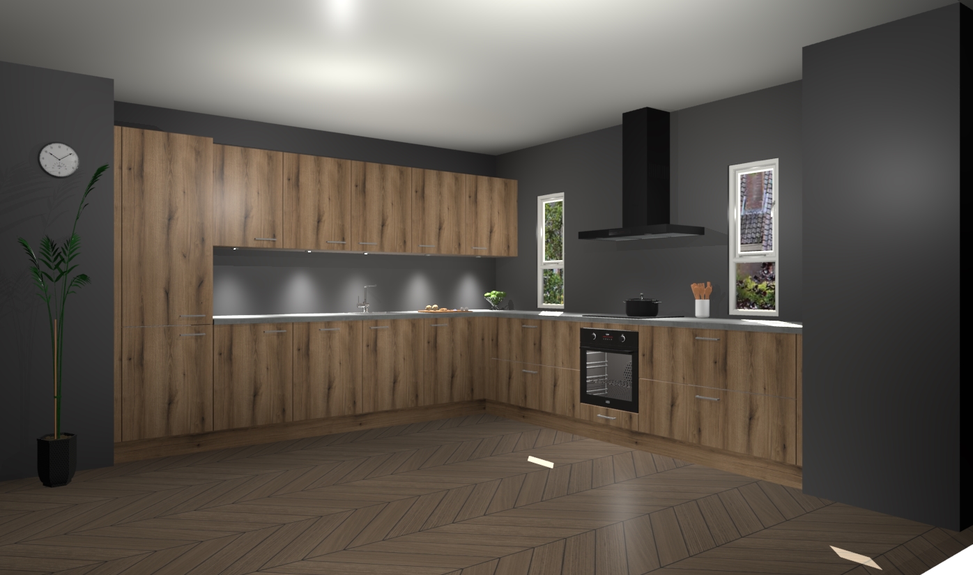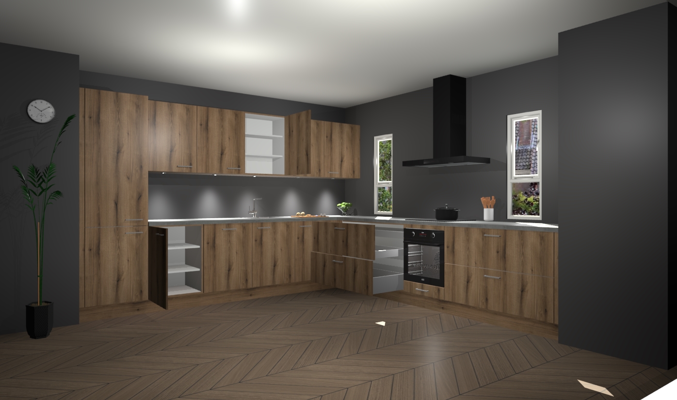 De goud eiken keuken is een ideale hoekkeuken en heeft alle functies en apparatuur die u maar nodig kunt hebben. Bij de bestelling krijgt u een oven, inductiekookplaat, afzuigkap, vaatwasser en koelkast - deze kunnen desgewenst eenvoudig worden uitgebreid naar AEG na bestellen. Elke kast wordt ook voor gemonteerd geleverd met soft close deuren die jarenlang gebruik beloven. Stelt u zich voor dat u geen gedoe heeft met vervelende montage - vanaf het moment dat u uw bestelling plaats, duurt het slechts 7 weken voor het bij u thuis geleverd wordt.