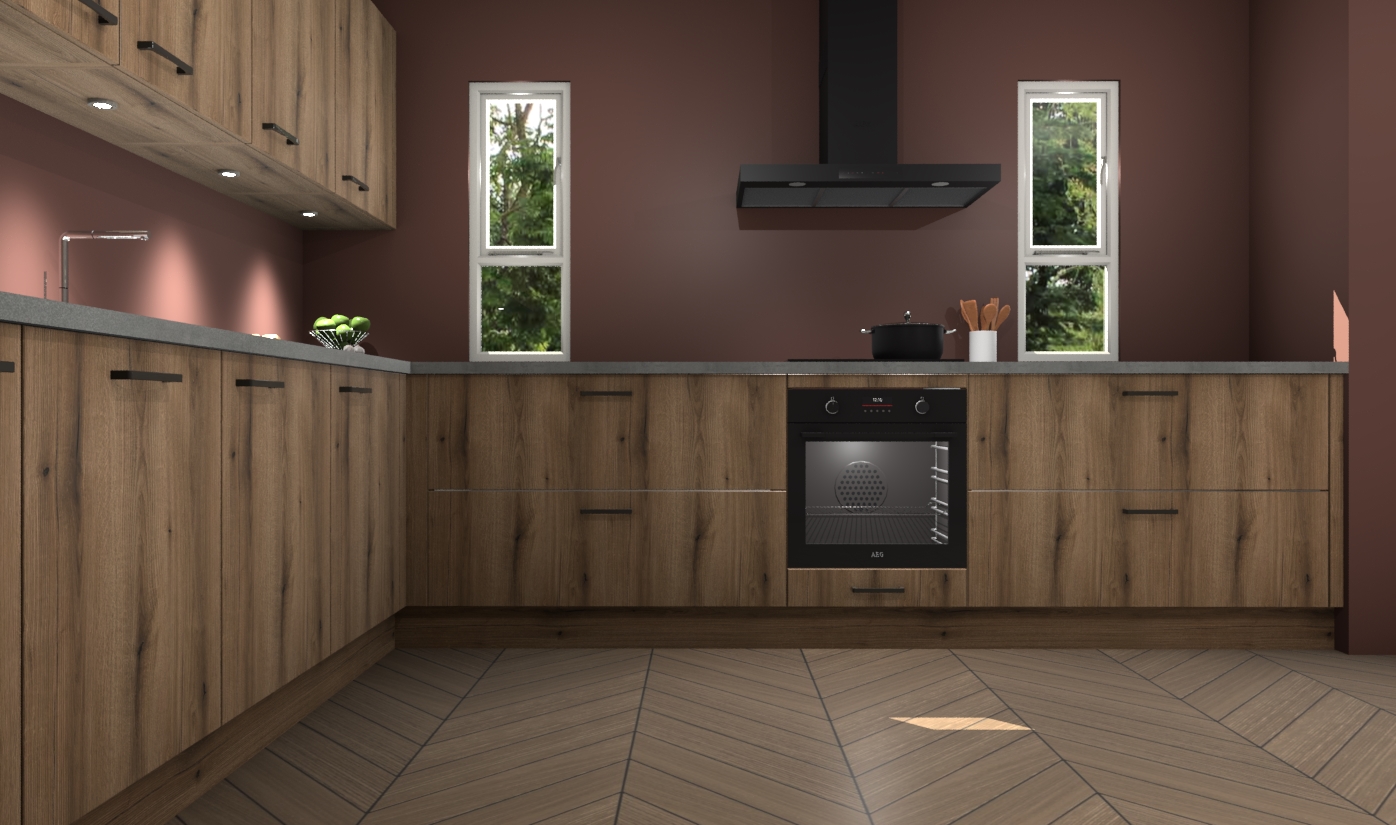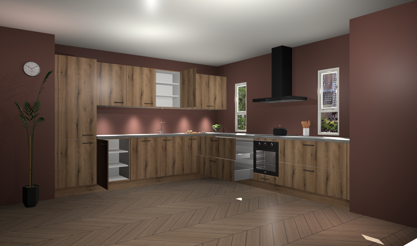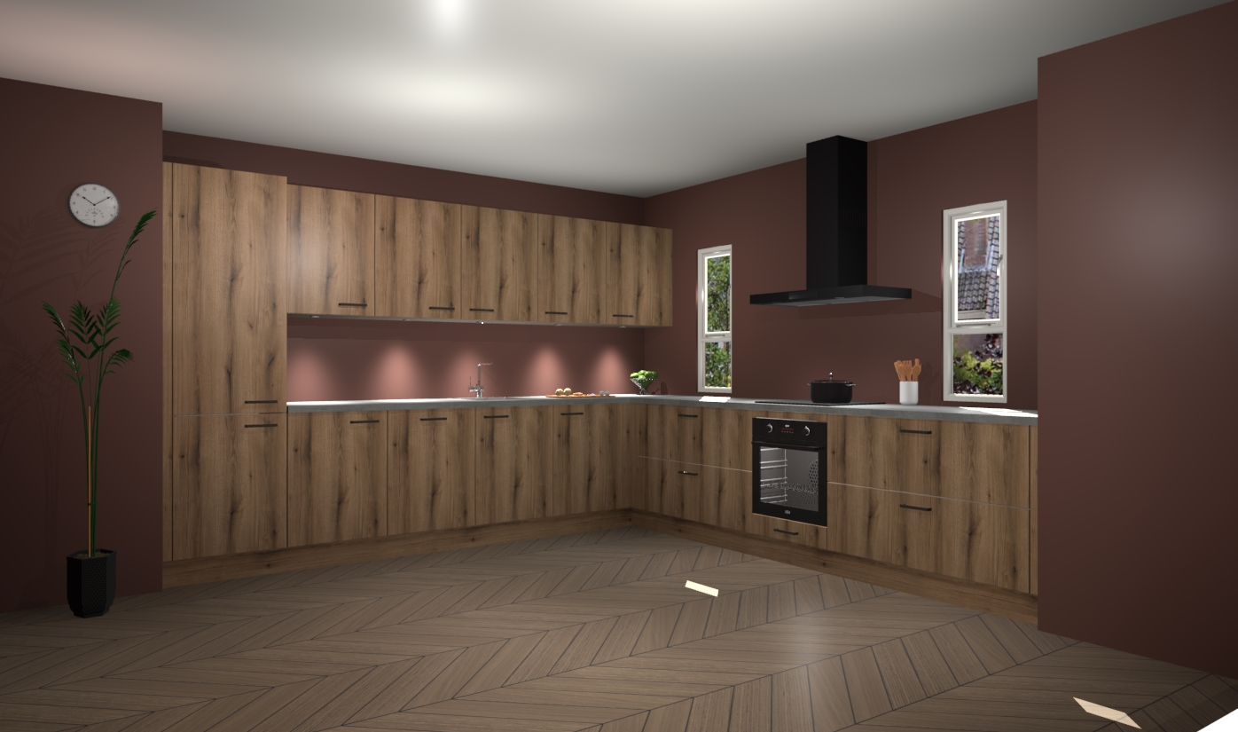 De goud eiken keuken is een ideale hoekkeuken en heeft alle functies en apparatuur die u maar nodig kunt hebben. Bij de bestelling krijgt u een oven, inductiekookplaat, afzuigkap, vaatwasser en koelkast - deze kunnen desgewenst eenvoudig worden uitgebreid naar AEG na bestellen. Elke kast wordt ook voor gemonteerd geleverd met soft close deuren die jarenlang gebruik beloven. Stelt u zich voor dat u geen gedoe heeft met vervelende montage - vanaf het moment dat u uw bestelling plaats, duurt het slechts 7 weken voor het bij u thuis geleverd wordt.