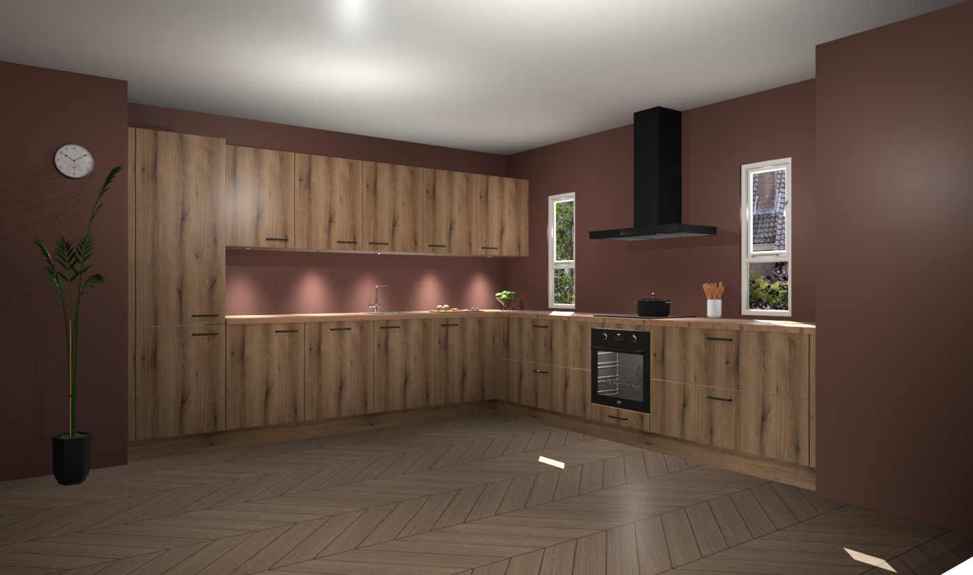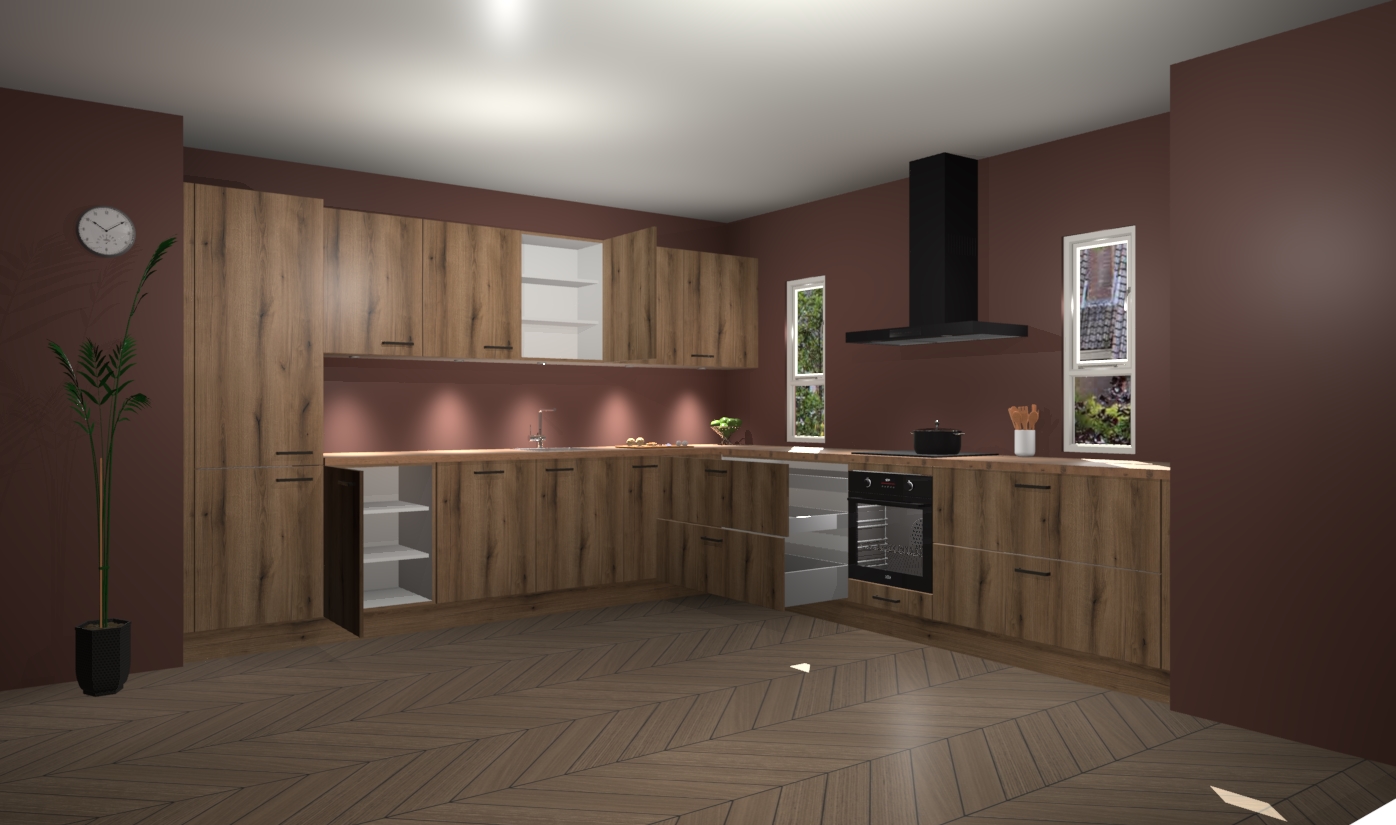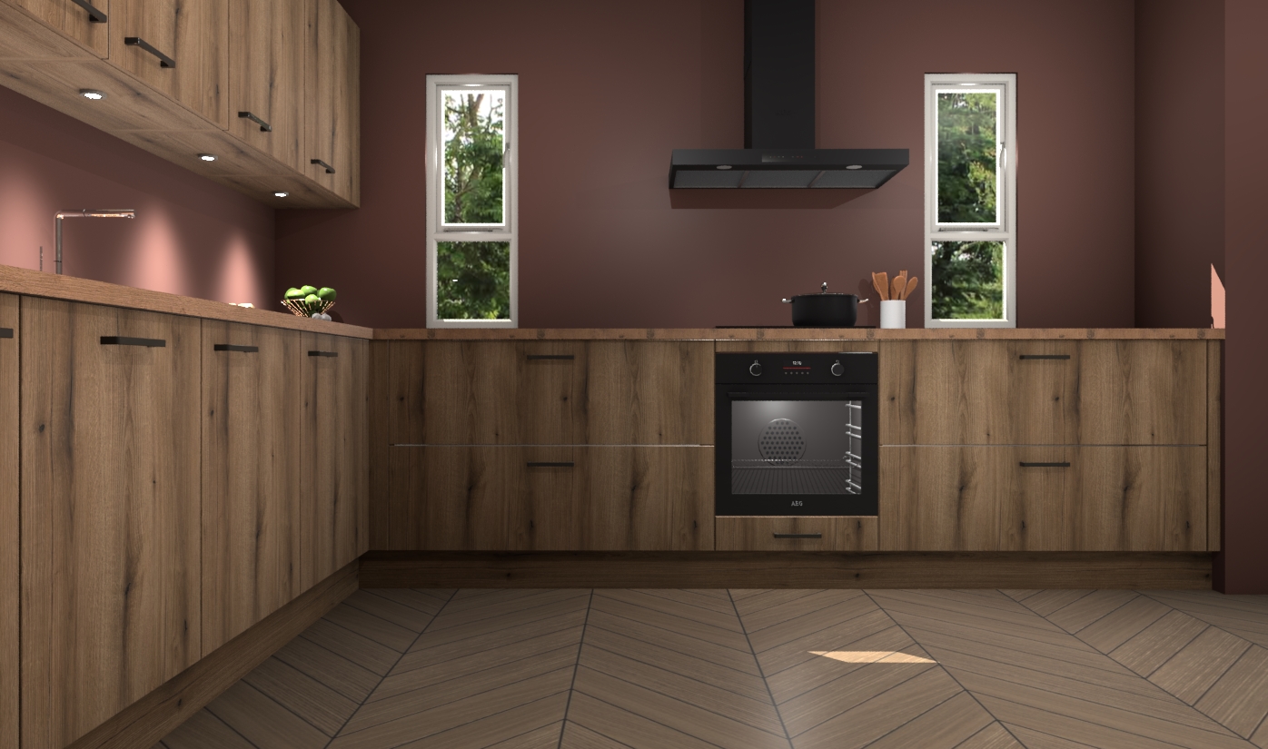 De goud eiken keuken is een ideale hoekkeuken en heeft alle functies en apparatuur die u maar nodig kunt hebben. Bij de bestelling krijgt u een oven, inductiekookplaat, afzuigkap, vaatwasser en koelkast - deze kunnen desgewenst eenvoudig worden uitgebreid naar AEG na bestellen. Elke kast wordt ook voor gemonteerd geleverd met soft close deuren die jarenlang gebruik beloven. Stelt u zich voor dat u geen gedoe heeft met vervelende montage - vanaf het moment dat u uw bestelling plaats, duurt het slechts 7 weken voor het bij u thuis geleverd wordt.