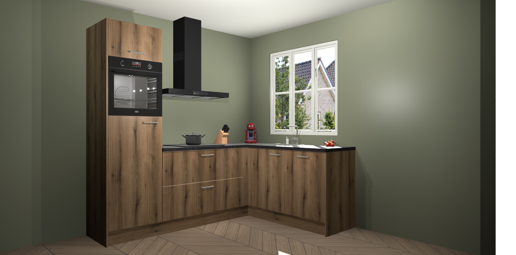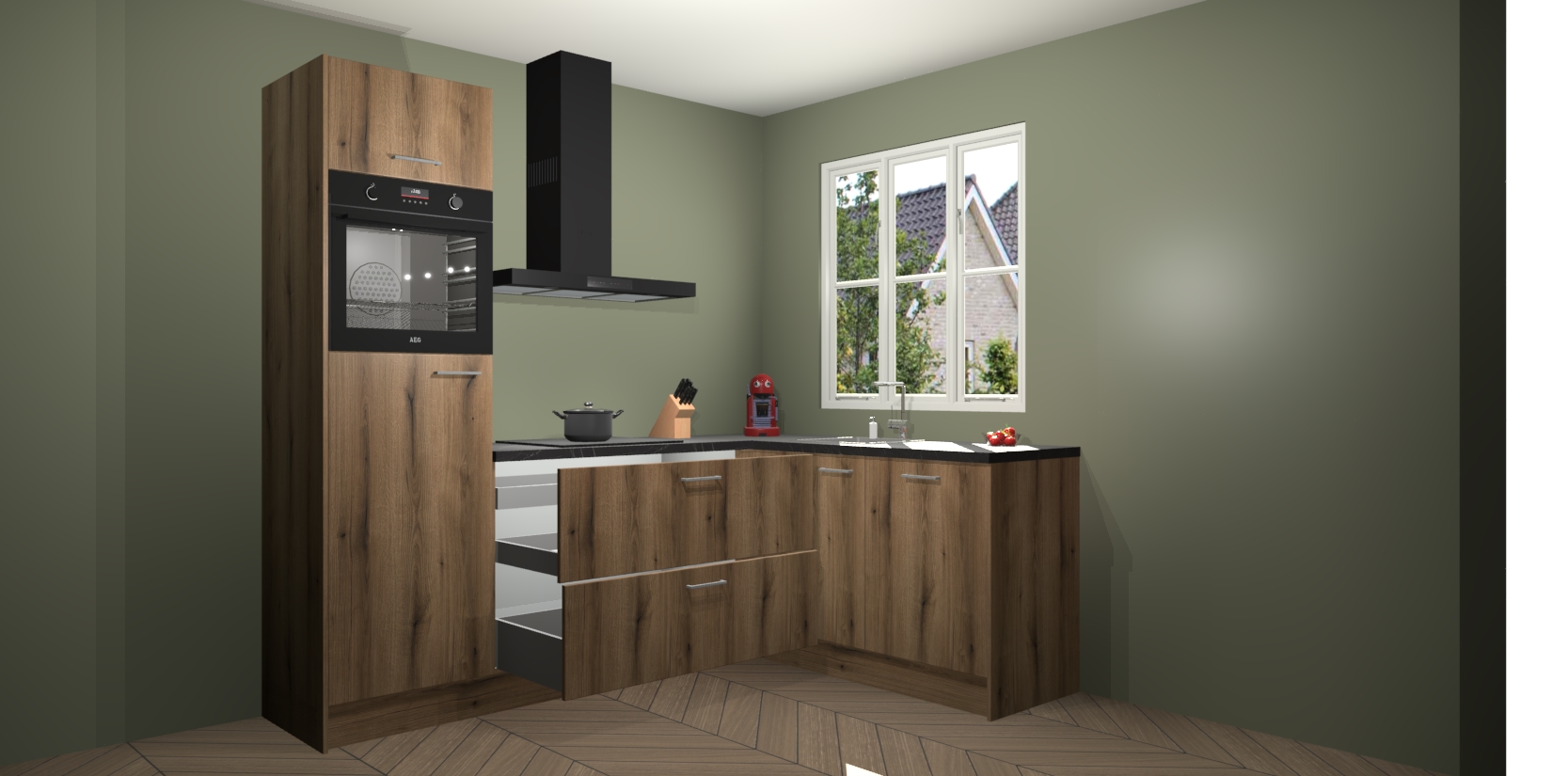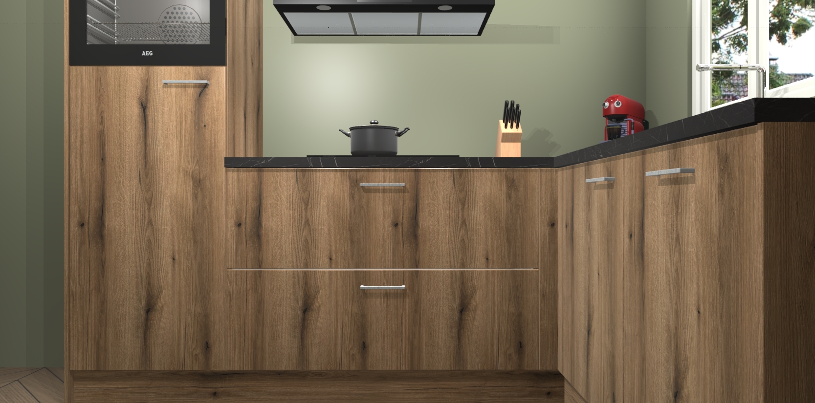 Dit model biedt u voldoende opbergruimte en vijf ingebouwde apparaten: een oven, inductiekookplaat, afzuigkap, vaatwasser en koelkast. Deze apparaten kunnen gemakkelijk worden geüpgrade naar AEG nadat u besteld heeft. De verschillende laden en kastjes bevatten softclose-deuren waardoor ze gezellig dichtvallen met een geruststellend helemaal geruisloos geluid. En dat is nog niet alles! We garanderen ook dat de prijs altijd laag blijft - dus haal nu uw Goud Eiken keuken Victoria terwijl het kan.