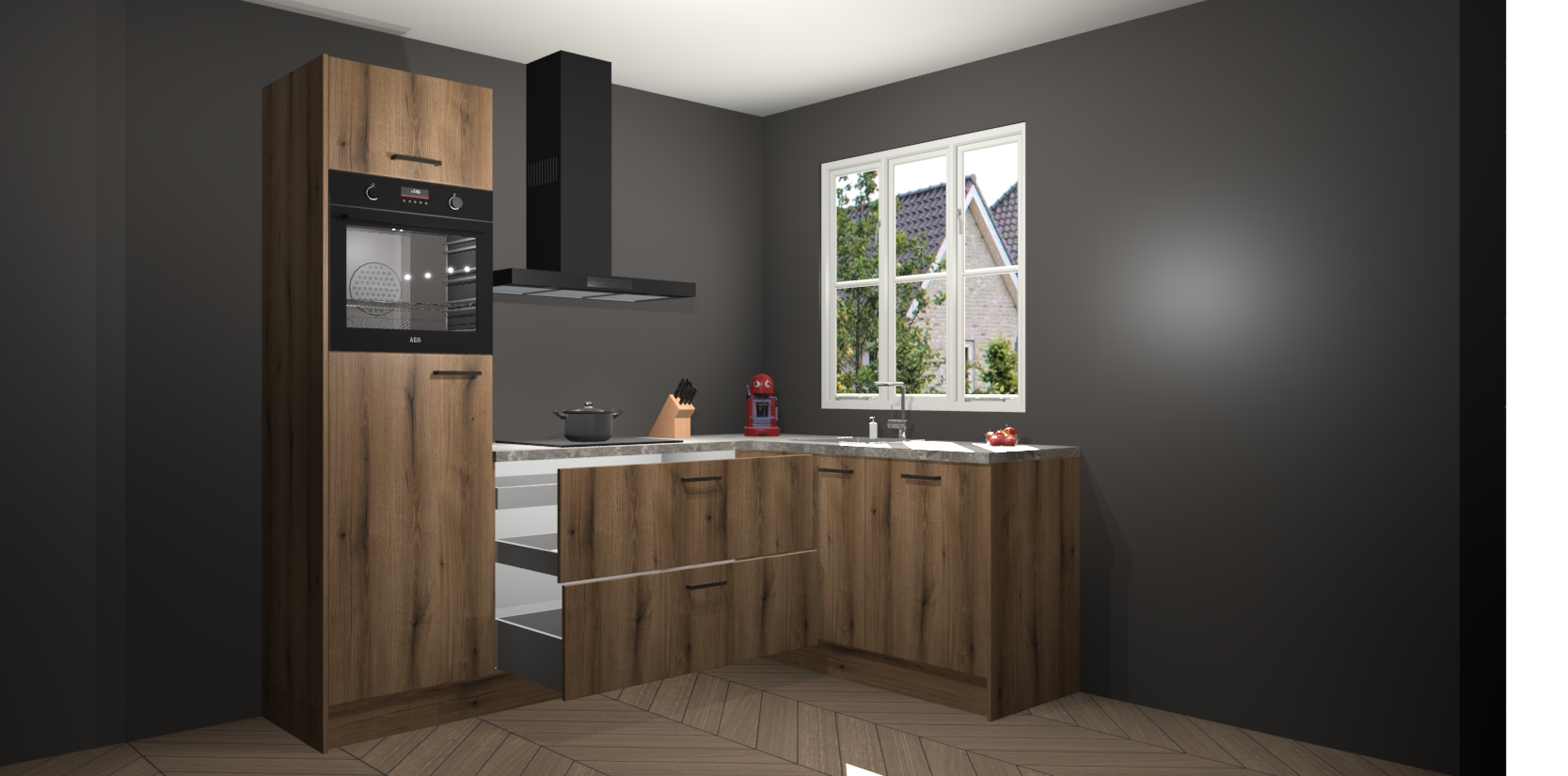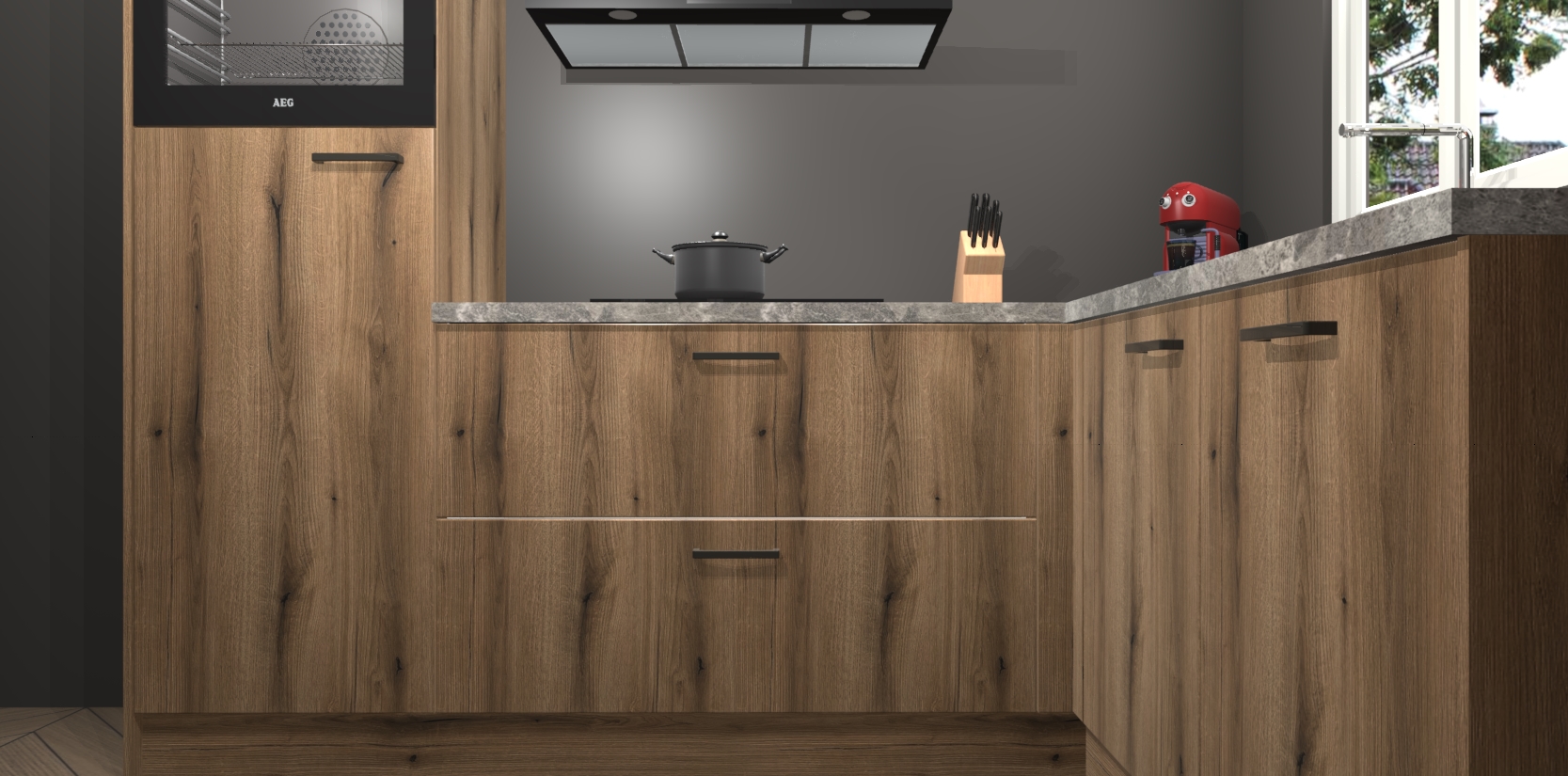 Dit model biedt u voldoende opbergruimte en vijf ingebouwde apparaten: een oven, inductiekookplaat, afzuigkap, vaatwasser en koelkast. Deze apparaten kunnen gemakkelijk worden geüpgrade naar AEG nadat u besteld heeft. De verschillende laden en kastjes bevatten softclose-deuren waardoor ze gezellig dichtvallen met een geruststellend helemaal geruisloos geluid. En dat is nog niet alles! We garanderen ook dat de prijs altijd laag blijft - dus haal nu uw Goud Eiken keuken Victoria terwijl het kan.