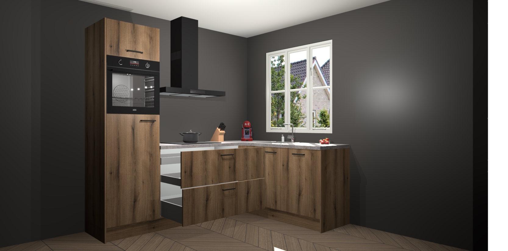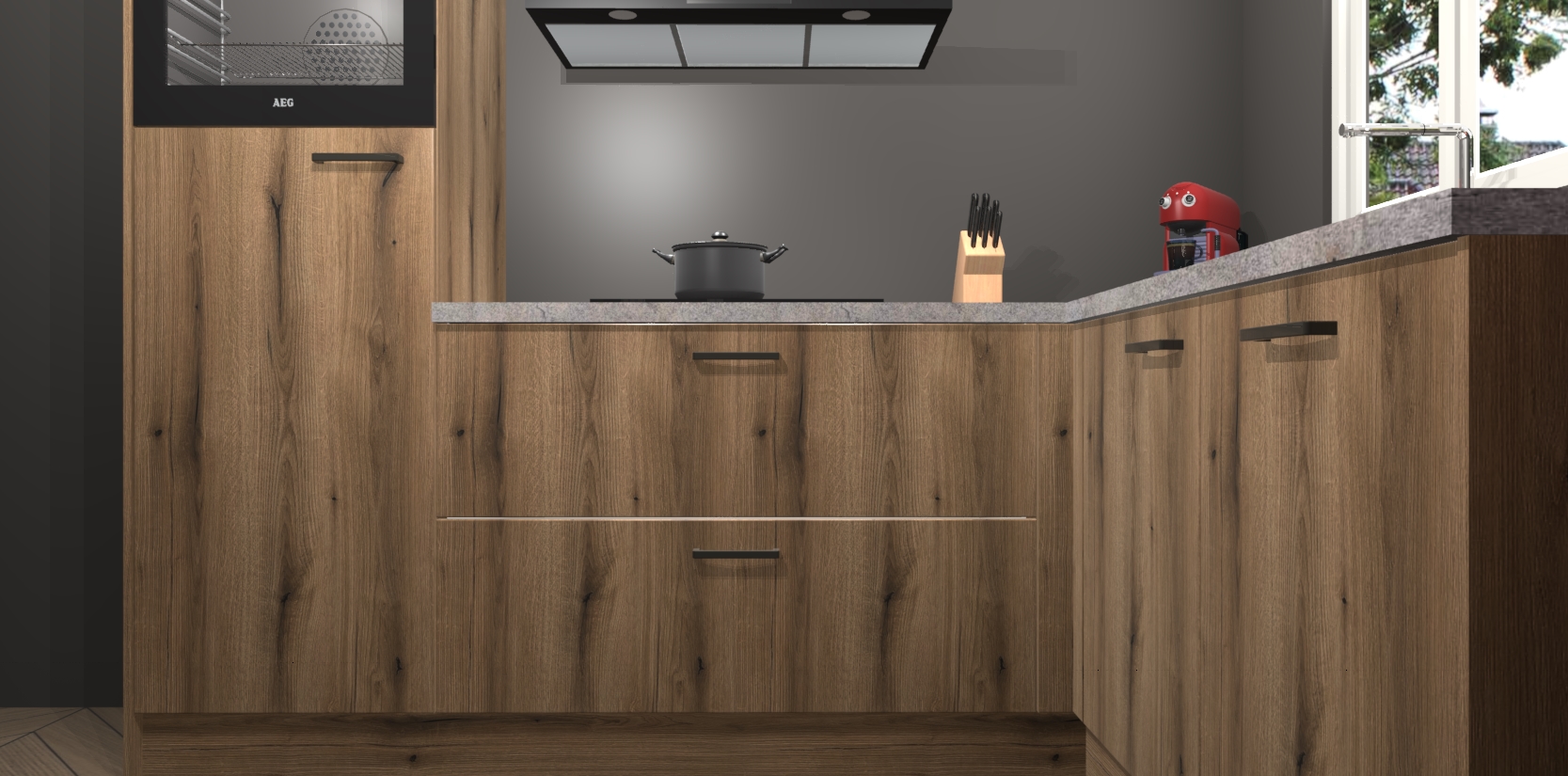 Dit model biedt u voldoende opbergruimte en vijf ingebouwde apparaten: een oven, inductiekookplaat, afzuigkap, vaatwasser en koelkast. Deze apparaten kunnen gemakkelijk worden geüpgrade naar AEG nadat u besteld heeft. De verschillende laden en kastjes bevatten softclose-deuren waardoor ze gezellig dichtvallen met een geruststellend helemaal geruisloos geluid. En dat is nog niet alles! We garanderen ook dat de prijs altijd laag blijft - dus haal nu uw Goud Eiken keuken Victoria terwijl het kan.