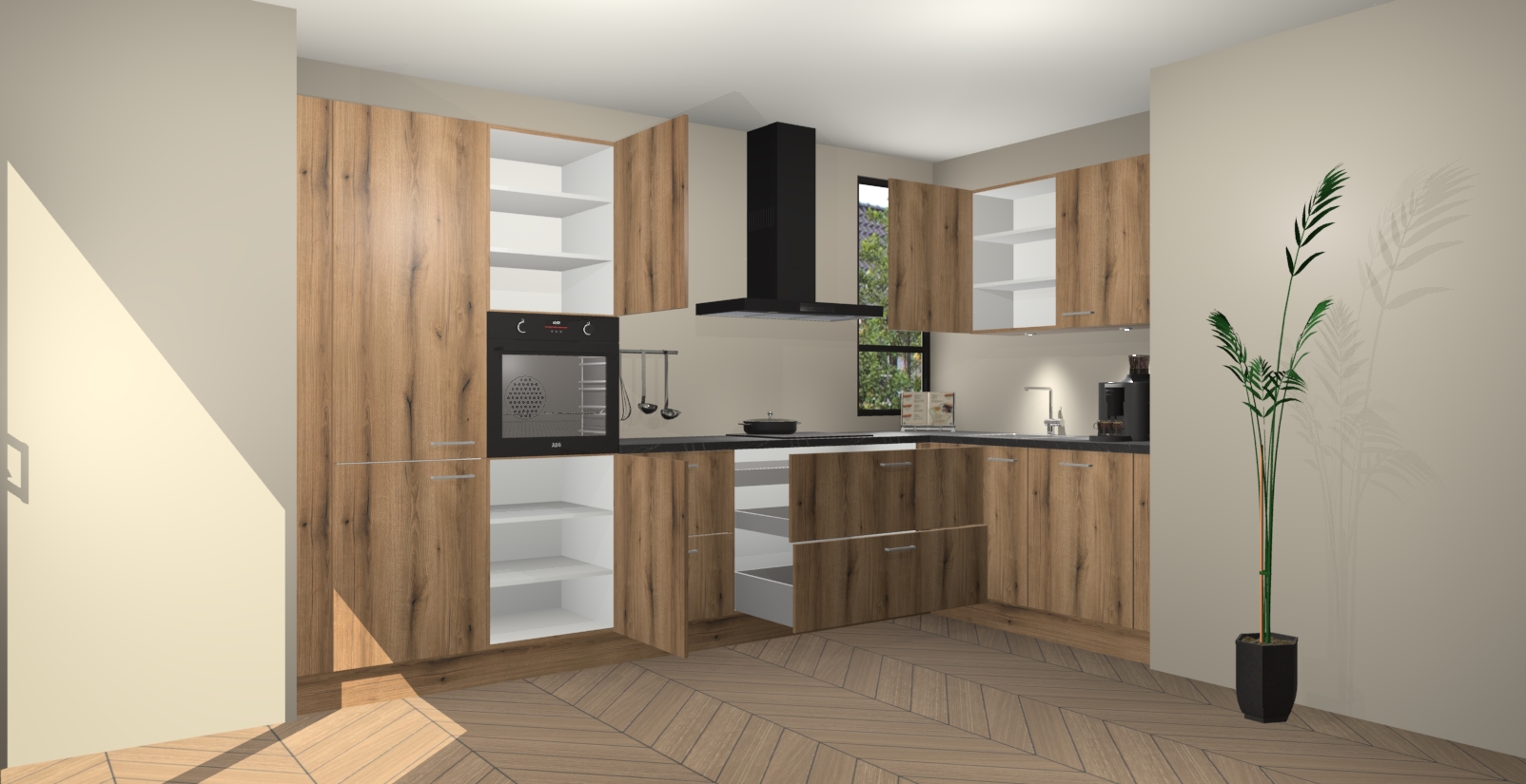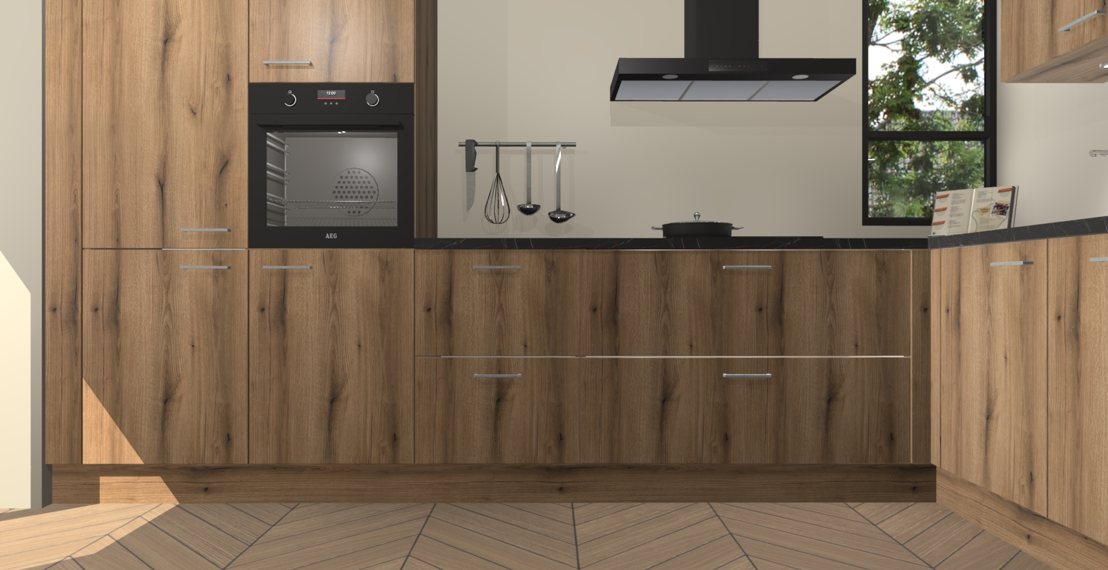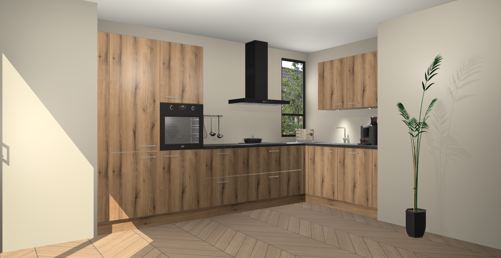 Welkom in uw nieuwe moderne keuken! Laat ons u voorstellen aan de Goud Eiken keuken Vlaanderen . Deze prachtige hoekkeuken straalt exclusiviteit en luxe uit als geen ander. Het strakke design, de tijdloze kleuren en het model maken van deze keuken een moderne klassieker. En met voldoende opbergruimte heeft deze keuken echt voor ieder wat wils.
