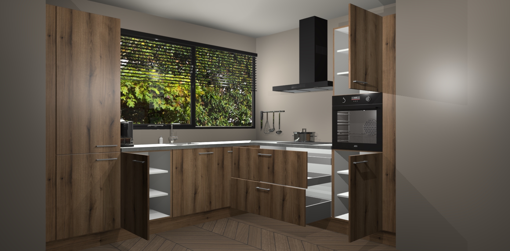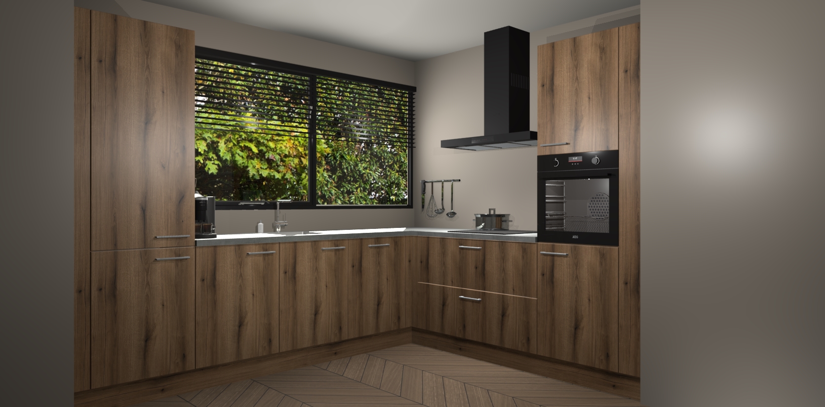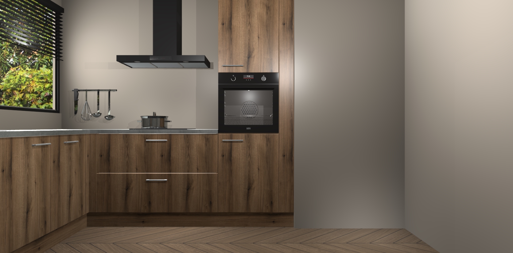 Met een modern, tijdloos design en ruime opslagruimte, zult u zich in no-time thuis voelen in uw nieuwe keuken. Uw leven wordt eenvoudiger met de soft-close deuren die voor het ultieme stille comfort zorgen - geen geluid dat u stoort terwijl u kookt. Ook is de keuken voorzien van 5 ingebouwde apparaten: een oven, inductie kookplaat, afzuigkap, vaatwasser en koelkast. Deze kunnen gemakkelijk na bestelling worden bijgewerkt naar AEG - waardoor uw luxe ervaring compleet is.