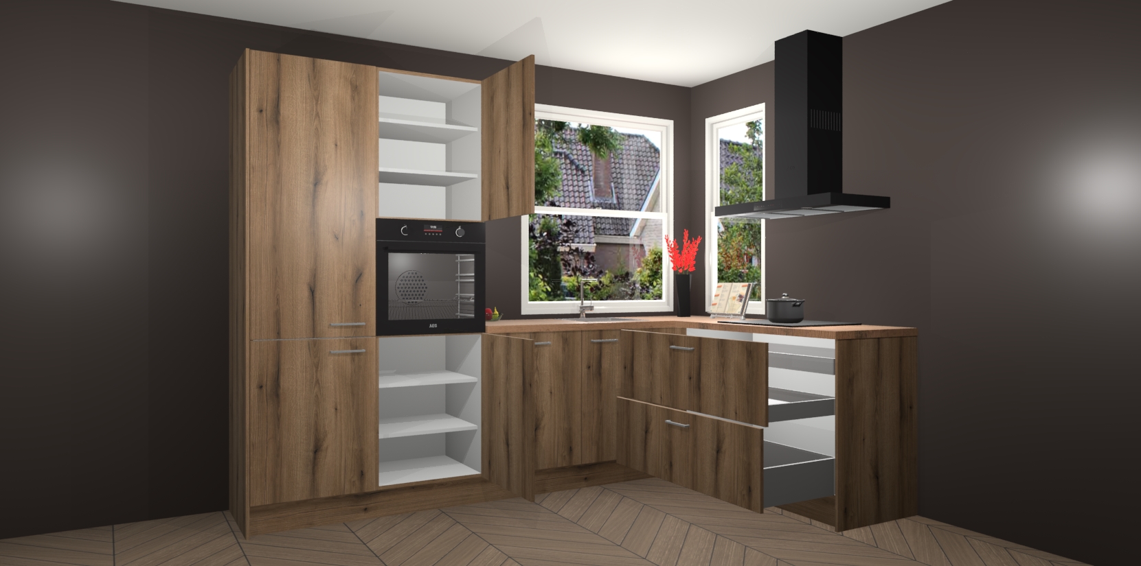 Het is tijd om halsoverkop verliefd te worden op uw droomkeuken, en de Goud Eiken keuken Kotor is precies wat u nodig heeft! Met een moderne, tijdloze constructie en een mix van prachtig design zal deze luxe hoekkeuken zeker opvallen. Maar laat de schoonheid u niet afleiden van de indrukwekkende functies - want onder dit alles schuilt een onovertroffen hoeveelheid lekkers!