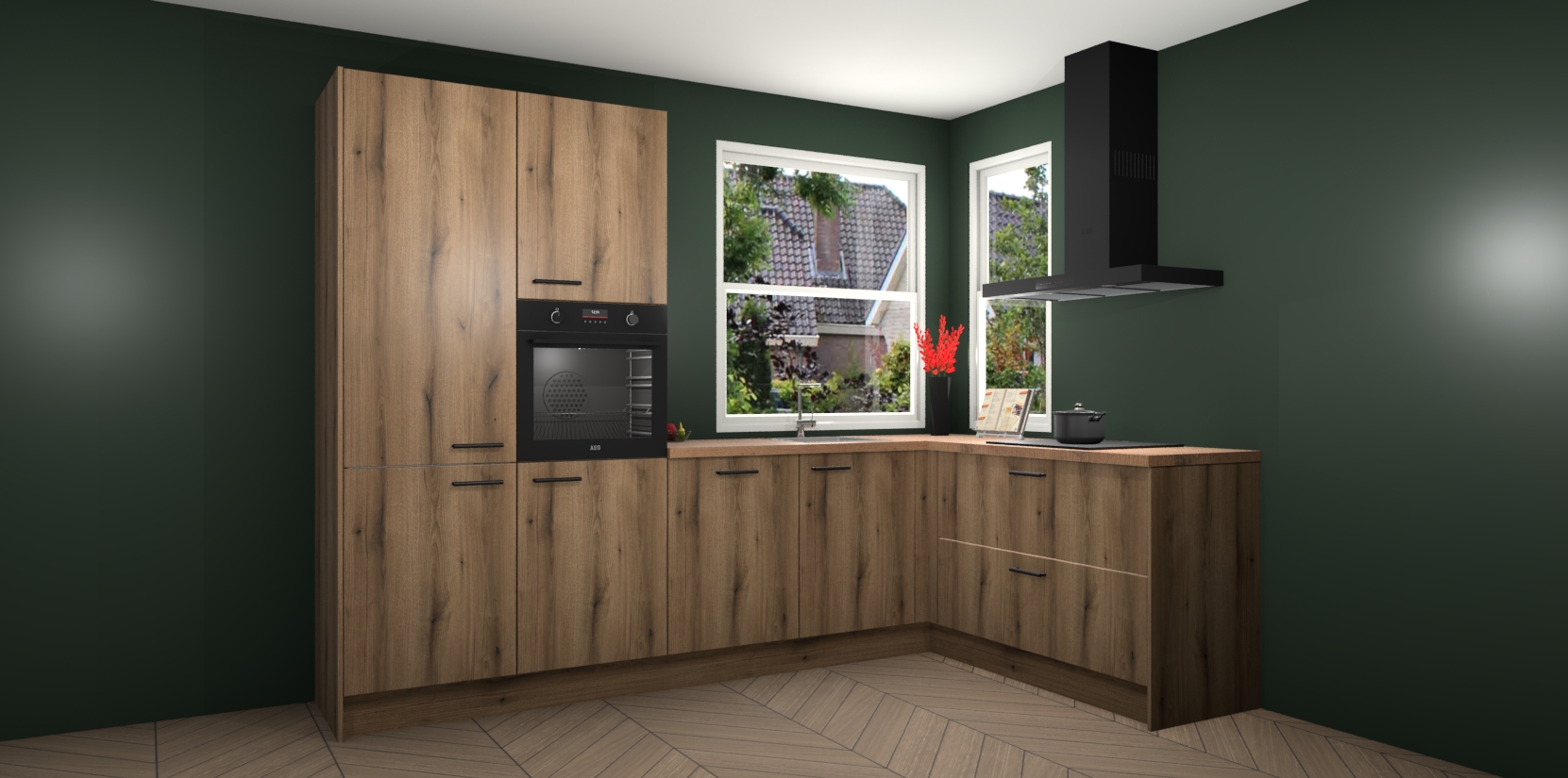 Elke Goud Eiken keuken Kotor wordt compleet geleverd met vijf inbouwapparaten, waaronder een oven, inductiekookplaat, afzuigkap, vaatwasser en koelkast. Sterker nog - indien gewenst kunt u deze apparaten na bestelling eenvoudig upgraden naar AEG! Extra functies zijn onder andere soft close deuren voor extra gemak, en elke kast wordt voor gemonteerd geleverd zodat u sneller van uw nieuwe keuken kunt genieten.
