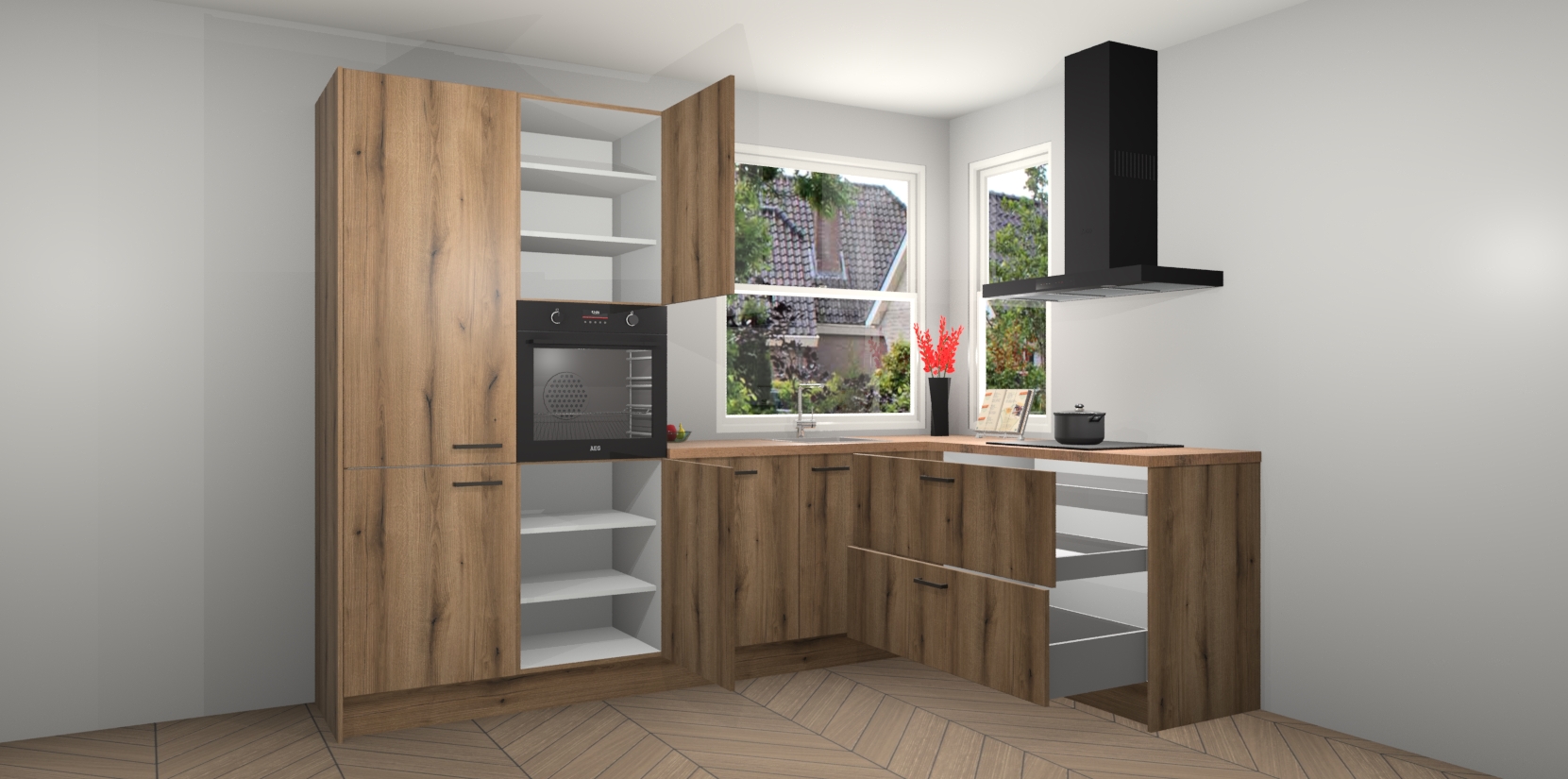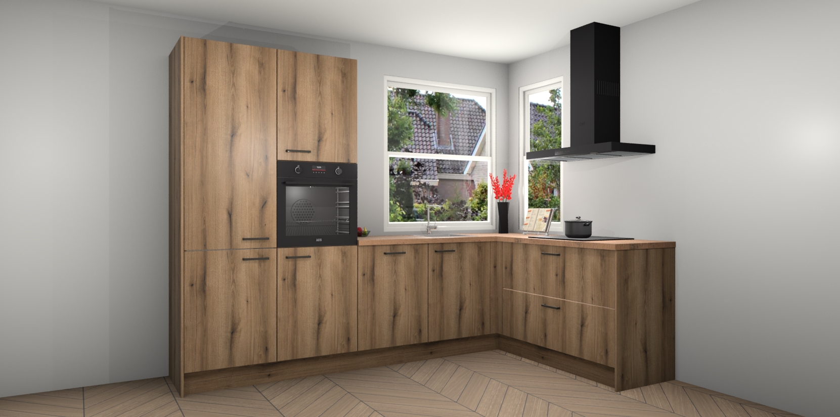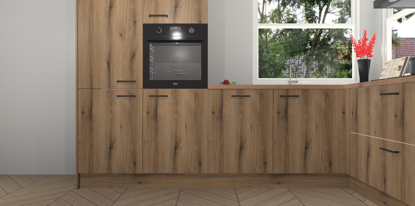 Elke Goud Eiken keuken Kotor wordt compleet geleverd met vijf inbouwapparaten, waaronder een oven, inductiekookplaat, afzuigkap, vaatwasser en koelkast. Sterker nog - indien gewenst kunt u deze apparaten na bestelling eenvoudig upgraden naar AEG! Extra functies zijn onder andere soft close deuren voor extra gemak, en elke kast wordt voor gemonteerd geleverd zodat u sneller van uw nieuwe keuken kunt genieten.