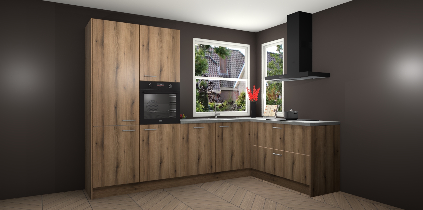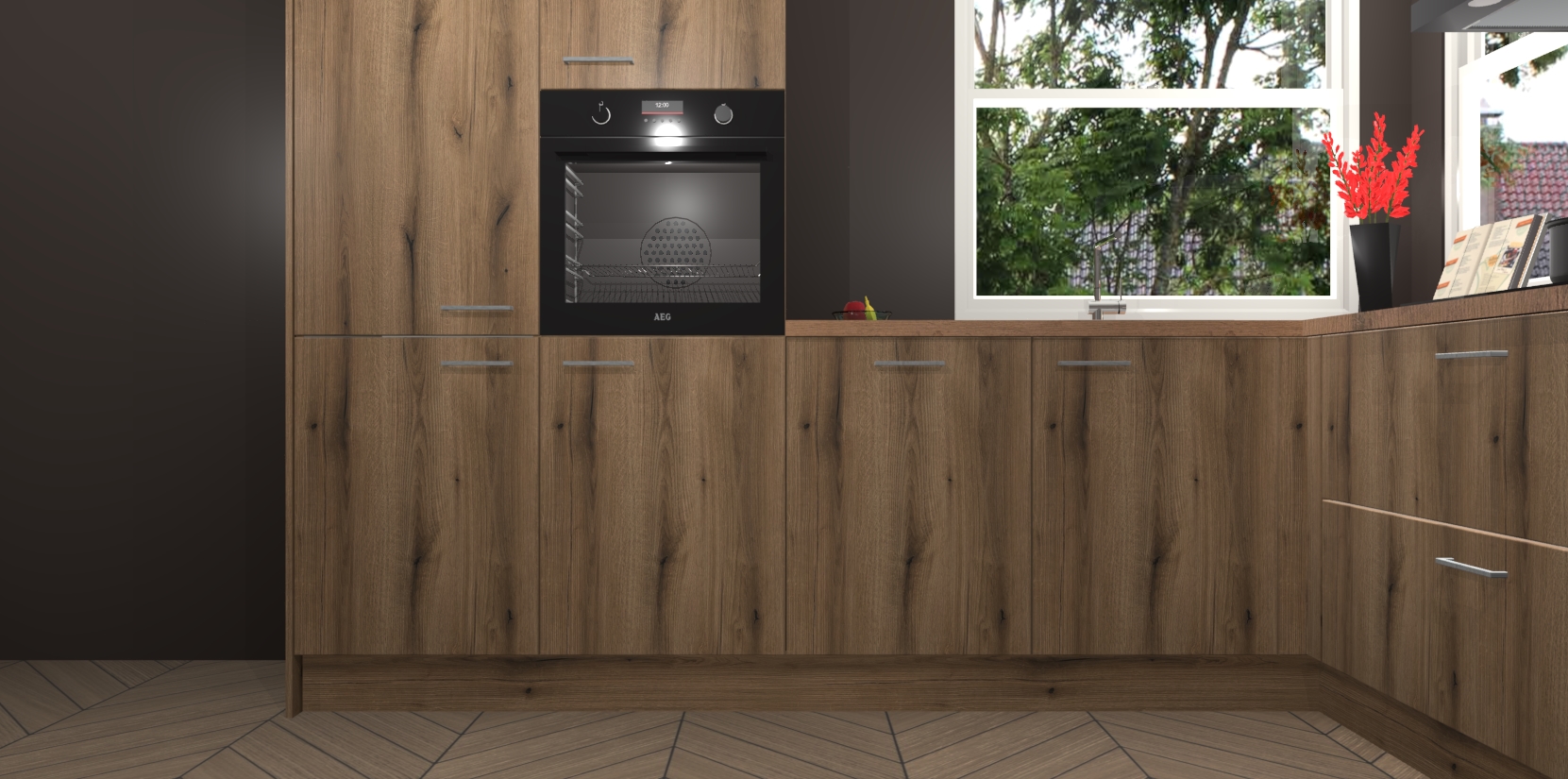 Elke Goud Eiken keuken Kotor wordt compleet geleverd met vijf inbouwapparaten, waaronder een oven, inductiekookplaat, afzuigkap, vaatwasser en koelkast. Sterker nog - indien gewenst kunt u deze apparaten na bestelling eenvoudig upgraden naar AEG! Extra functies zijn onder andere soft close deuren voor extra gemak, en elke kast wordt voor gemonteerd geleverd zodat u sneller van uw nieuwe keuken kunt genieten.