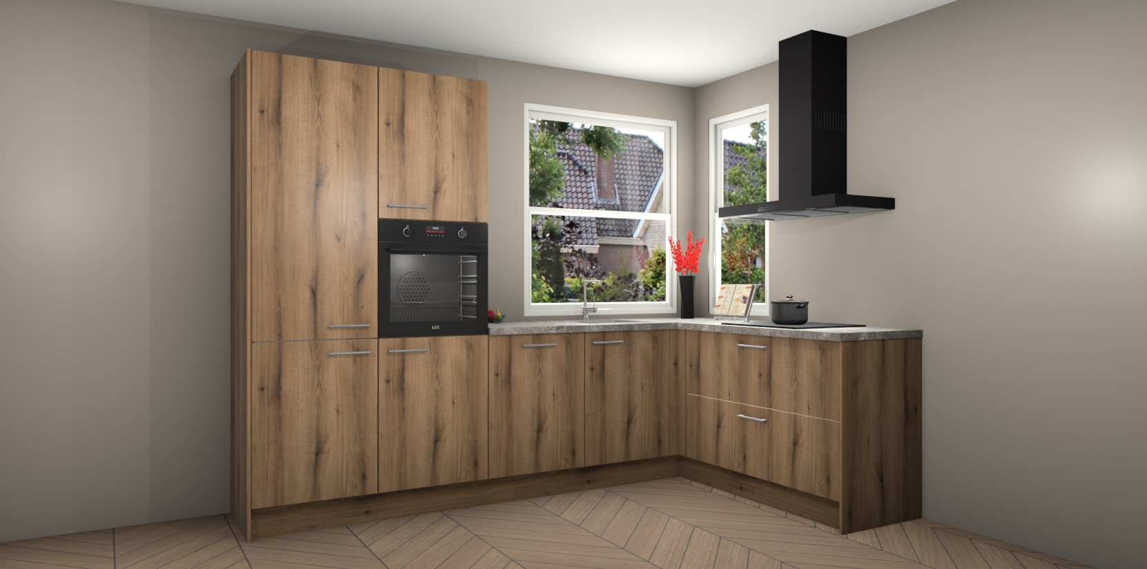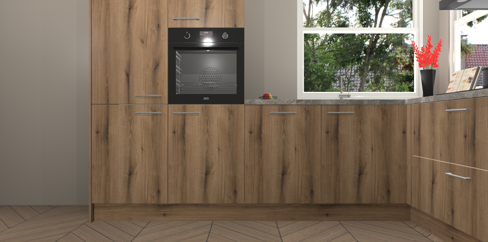 Elke Goud Eiken keuken Kotor wordt compleet geleverd met vijf inbouwapparaten, waaronder een oven, inductiekookplaat, afzuigkap, vaatwasser en koelkast. Sterker nog - indien gewenst kunt u deze apparaten na bestelling eenvoudig upgraden naar AEG! Extra functies zijn onder andere soft close deuren voor extra gemak, en elke kast wordt voor gemonteerd geleverd zodat u sneller van uw nieuwe keuken kunt genieten.