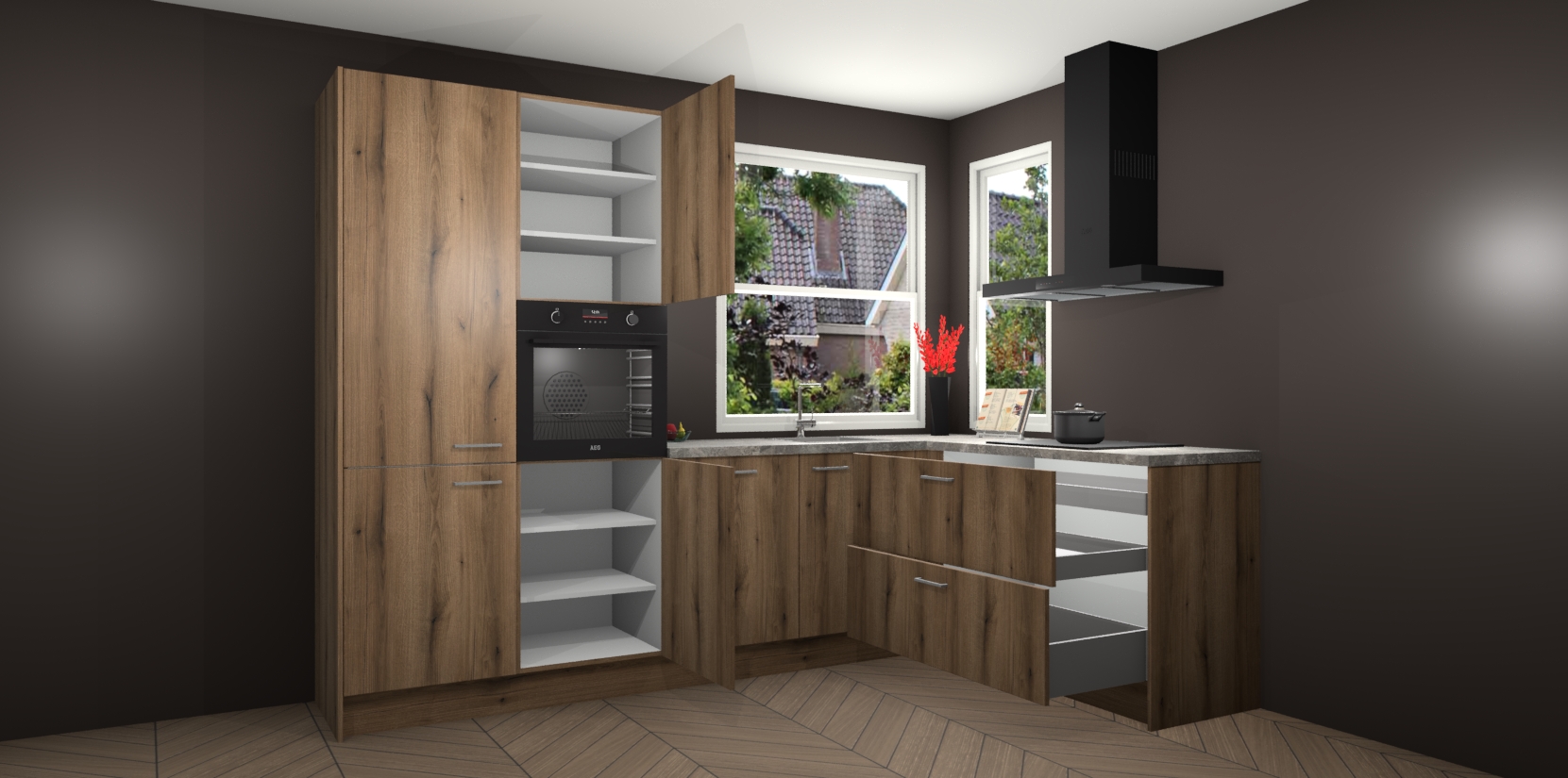 Het is tijd om halsoverkop verliefd te worden op uw droomkeuken, en de Goud Eiken keuken Kotor is precies wat u nodig heeft! Met een moderne, tijdloze constructie en een mix van prachtig design zal deze luxe hoekkeuken zeker opvallen. Maar laat de schoonheid u niet afleiden van de indrukwekkende functies - want onder dit alles schuilt een onovertroffen hoeveelheid lekkers!