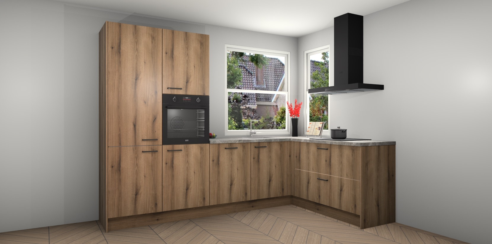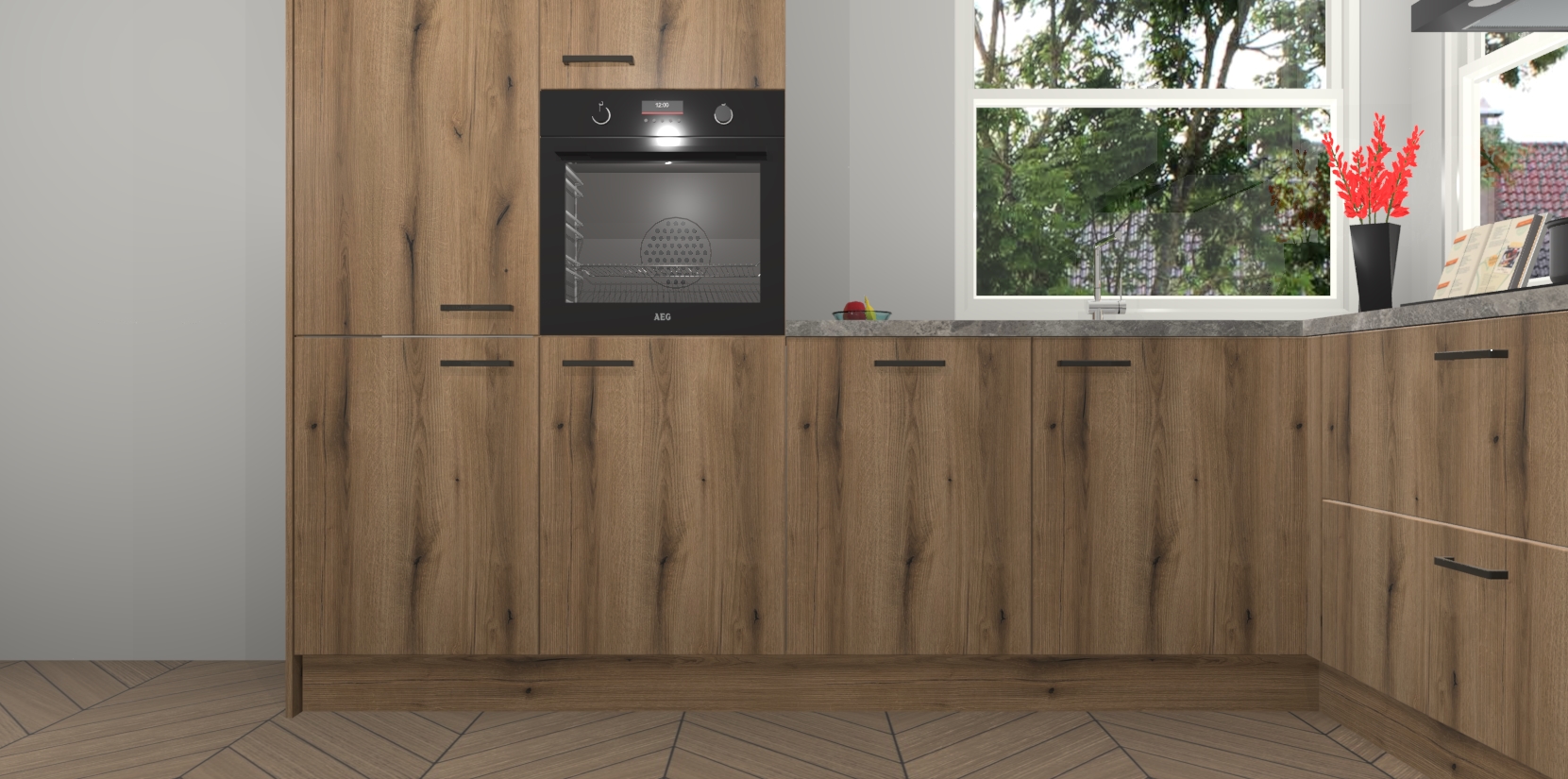 Elke Goud Eiken keuken Kotor wordt compleet geleverd met vijf inbouwapparaten, waaronder een oven, inductiekookplaat, afzuigkap, vaatwasser en koelkast. Sterker nog - indien gewenst kunt u deze apparaten na bestelling eenvoudig upgraden naar AEG! Extra functies zijn onder andere soft close deuren voor extra gemak, en elke kast wordt voor gemonteerd geleverd zodat u sneller van uw nieuwe keuken kunt genieten.