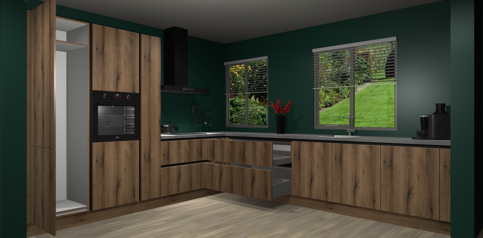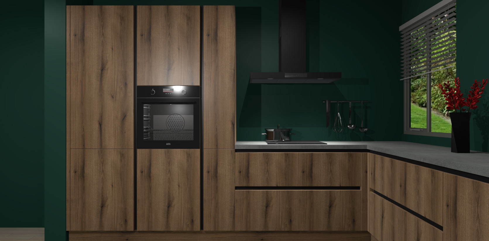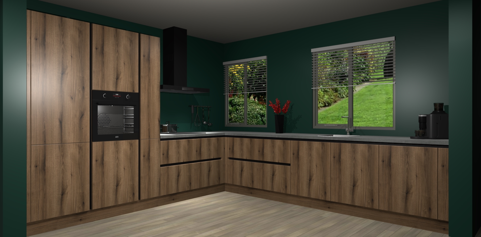Welkom bij de Gouden Eiken keuken Palermo. Deze prachtige keuken zal de komende jaren het middelpunt van de belangstelling in uw huis zijn. Uitgerust met vijf inbouwapparaten komt u nooit kookgereedschap tekort. Bovendien geeft de warme houtlook elke ruimte een uitnodigende en tijdloze uitstraling.