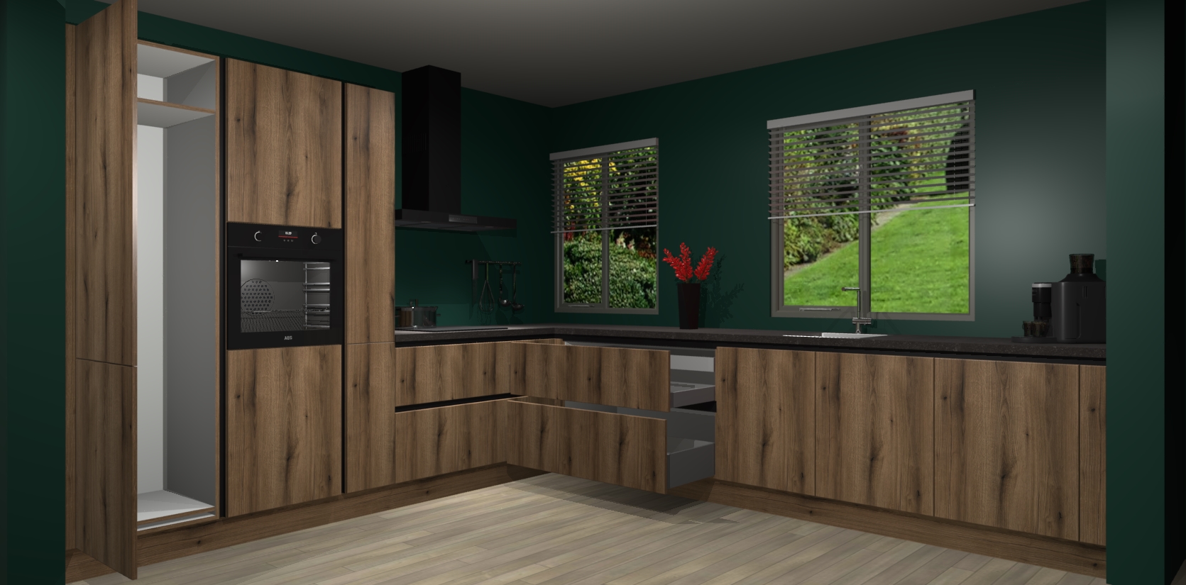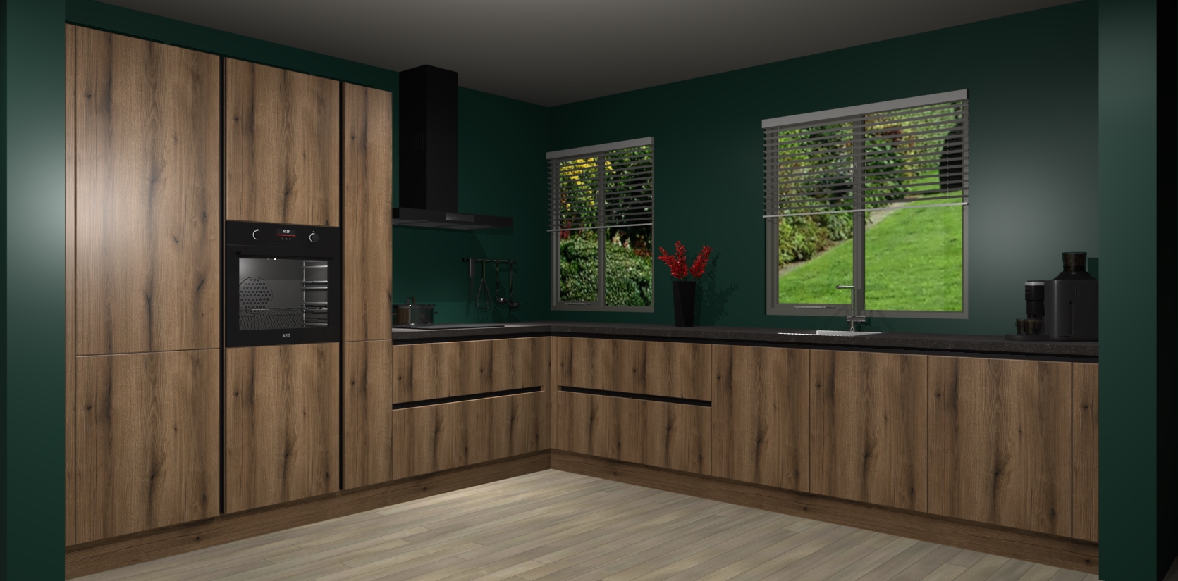 Welkom bij de Gouden Eiken keuken Palermo. Deze prachtige keuken zal de komende jaren het middelpunt van de belangstelling in uw huis zijn. Uitgerust met vijf inbouwapparaten komt u nooit kookgereedschap tekort. Bovendien geeft de warme houtlook elke ruimte een uitnodigende en tijdloze uitstraling.