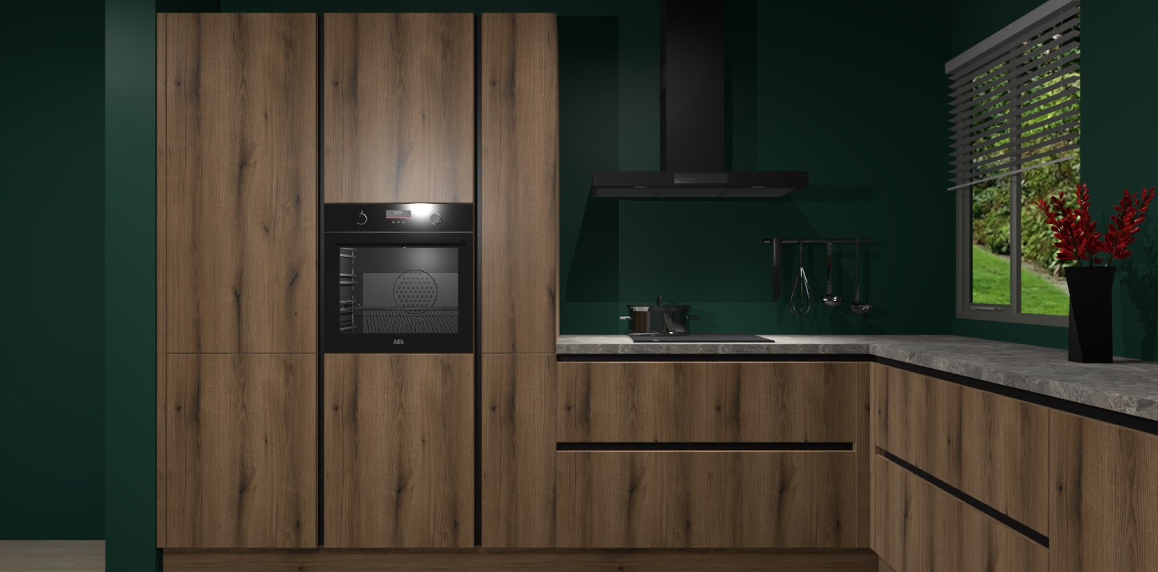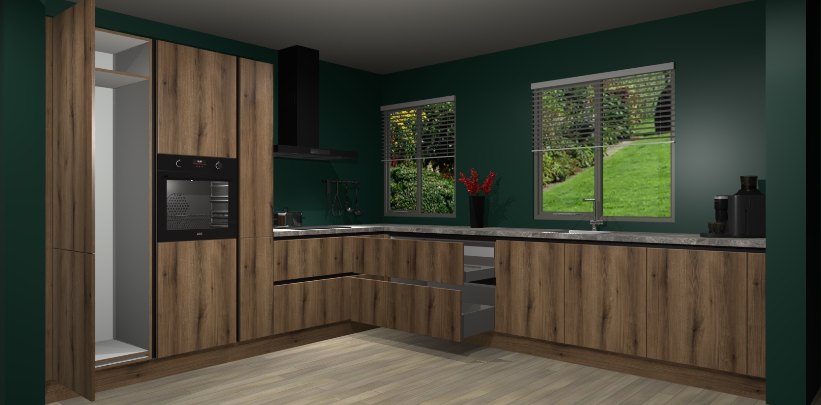 Welkom bij de Gouden Eiken keuken Palermo. Deze prachtige keuken zal de komende jaren het middelpunt van de belangstelling in uw huis zijn. Uitgerust met vijf inbouwapparaten komt u nooit kookgereedschap tekort. Bovendien geeft de warme houtlook elke ruimte een uitnodigende en tijdloze uitstraling.