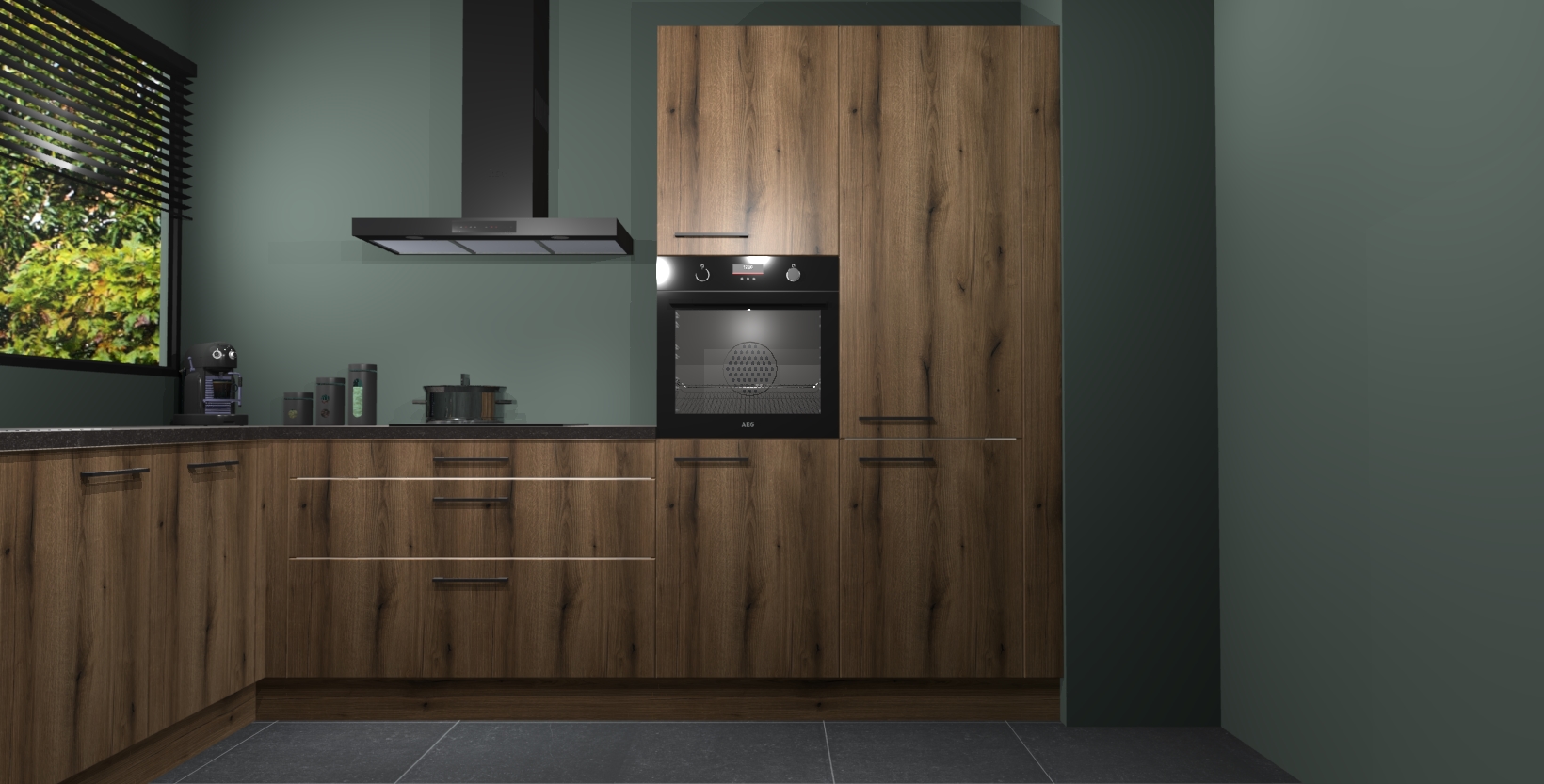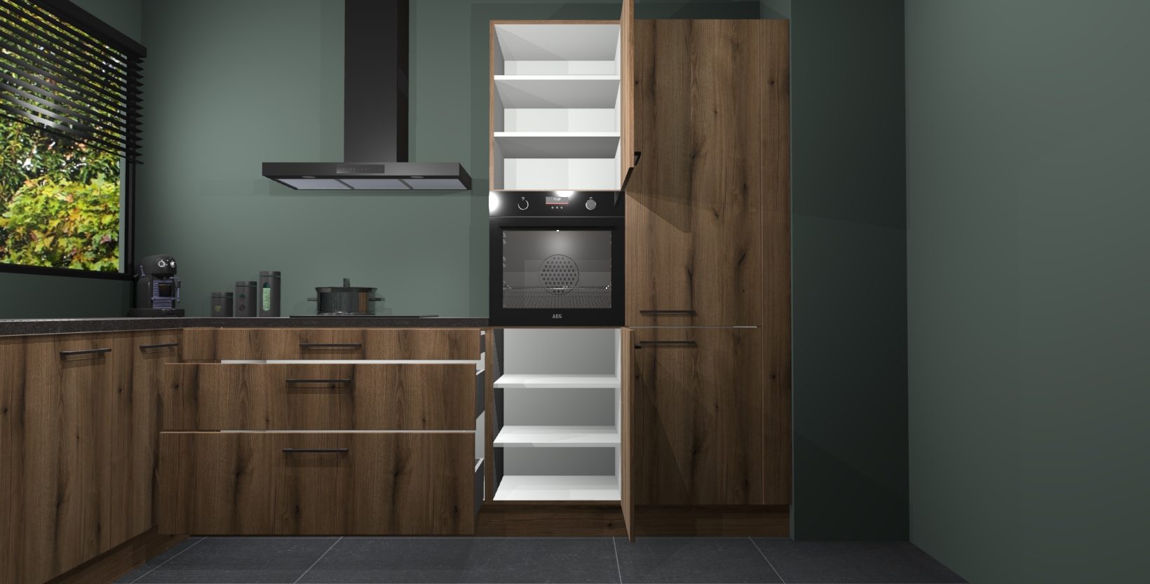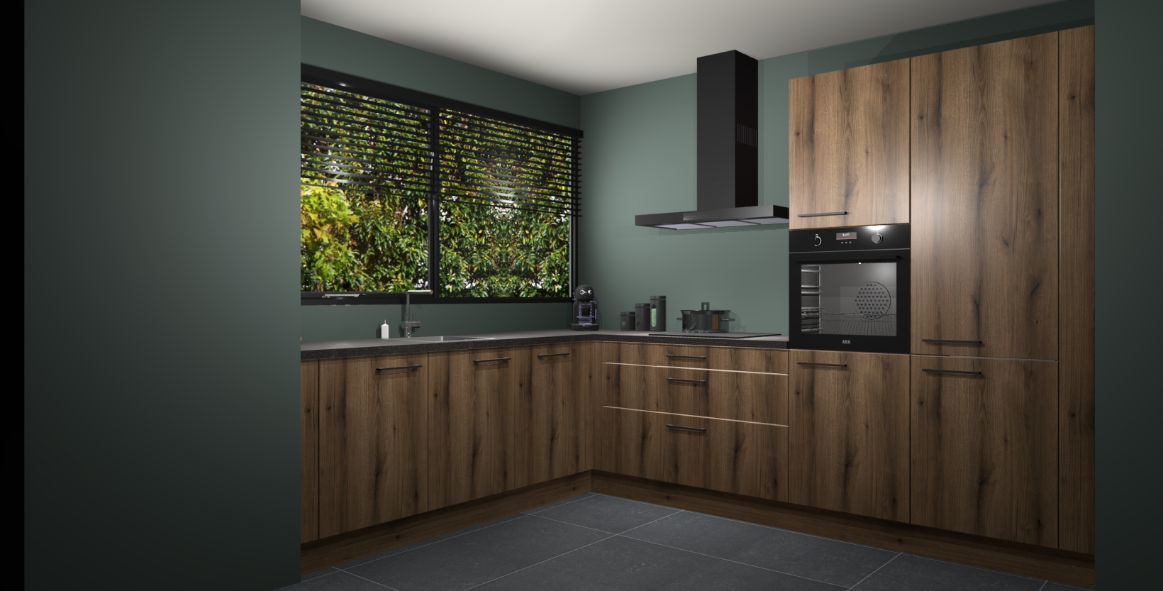 Met een modern, tijdloos design en ruime opslagruimte, zult u zich in no-time thuis voelen in uw nieuwe keuken. Uw leven wordt eenvoudiger met de soft-close deuren die voor het ultieme stille comfort zorgen - geen geluid dat u stoort terwijl u kookt. Ook is de keuken voorzien van 5 ingebouwde apparaten: een oven, inductie kookplaat, afzuigkap, vaatwasser en koelkast. Deze kunnen gemakkelijk na bestelling worden bijgewerkt naar AEG - waardoor uw luxe ervaring compleet is.