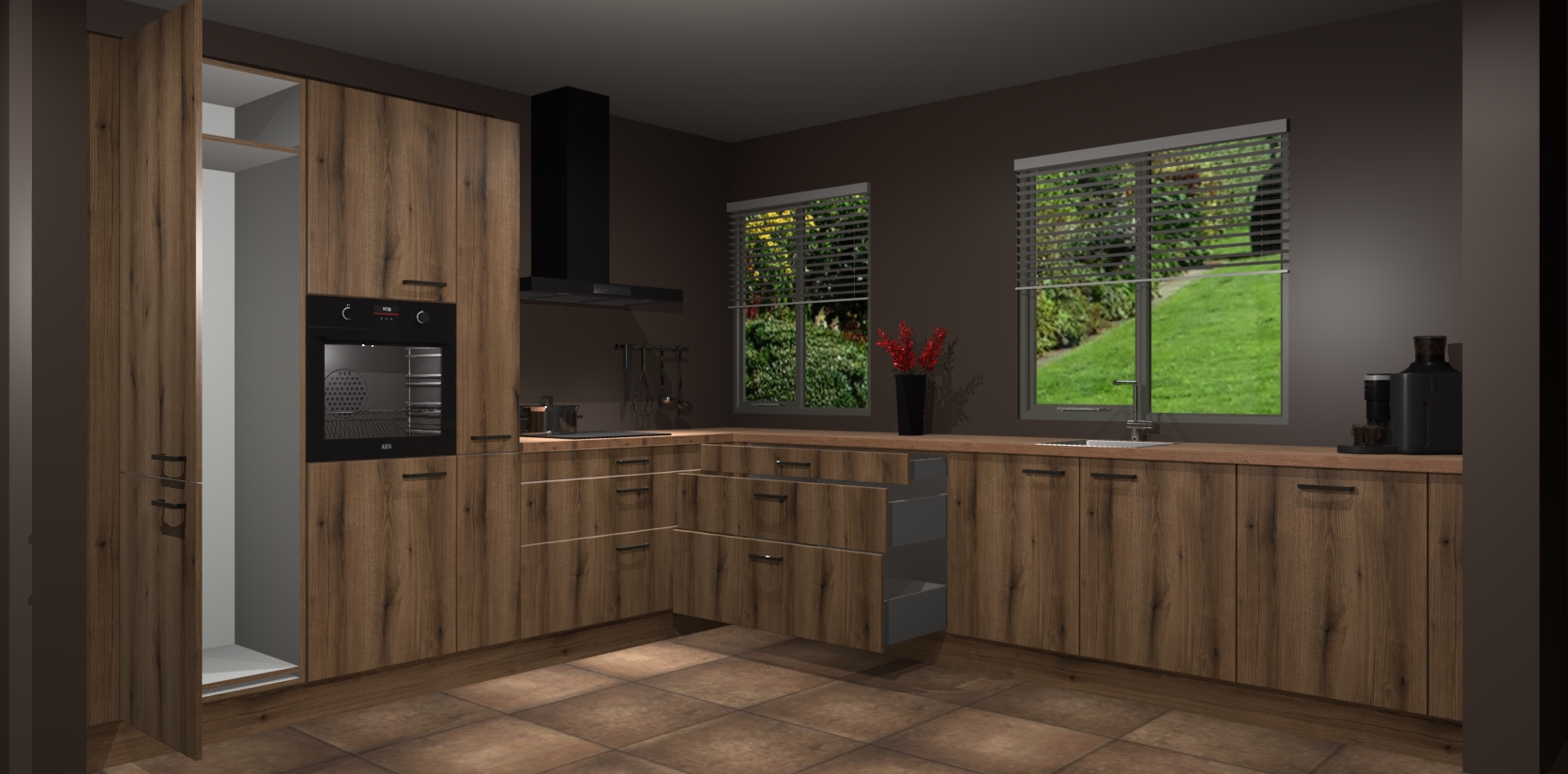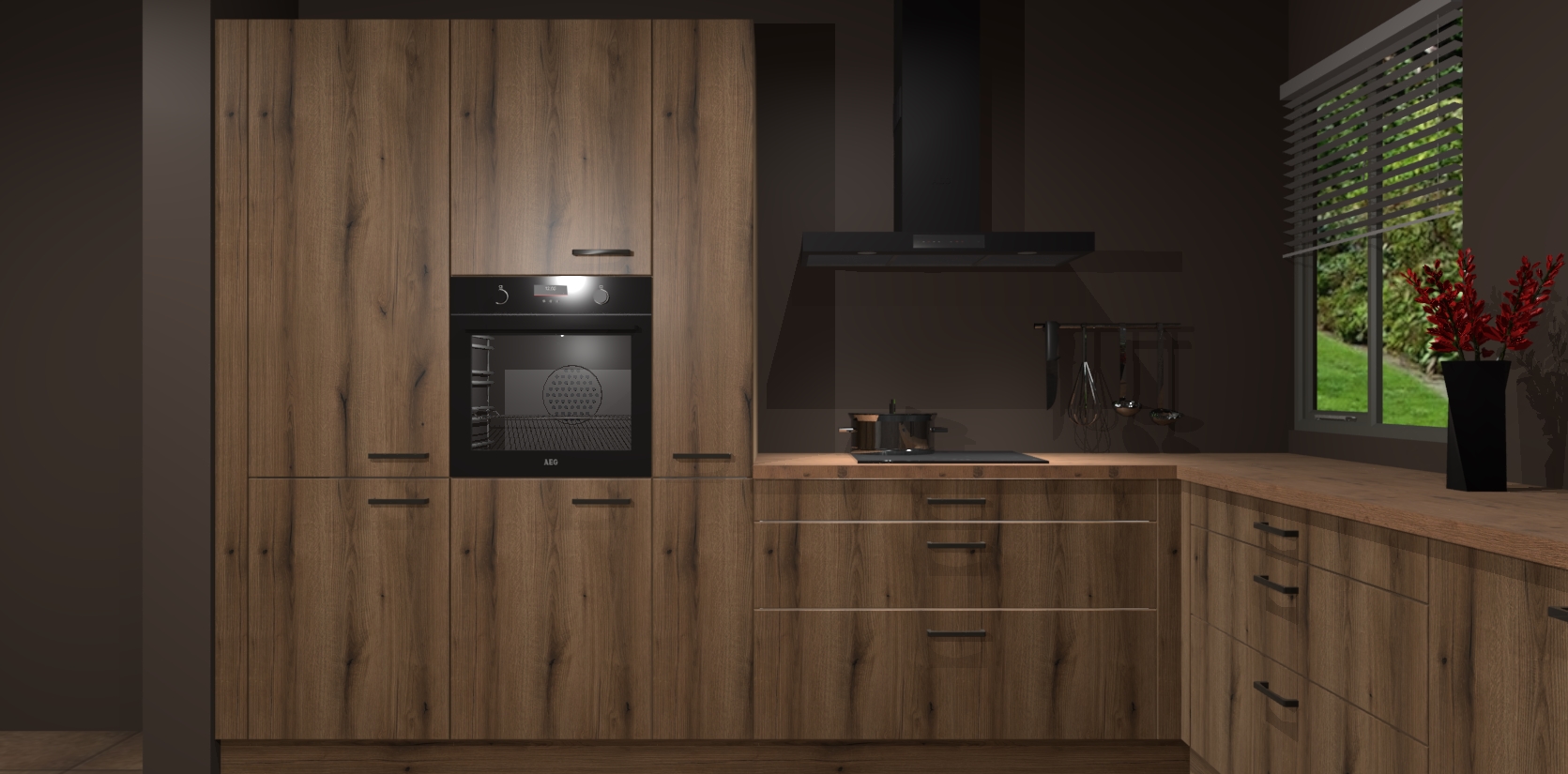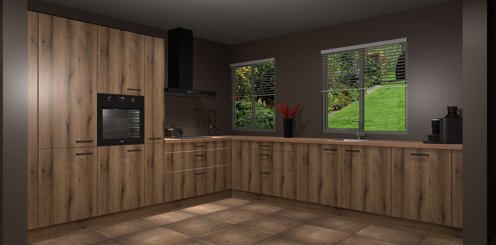 Welkom bij de Gouden Eiken keuken Palermo. Deze prachtige keuken zal de komende jaren het middelpunt van de belangstelling in uw huis zijn. Uitgerust met vijf inbouwapparaten komt u nooit kookgereedschap tekort. Bovendien geeft de warme houtlook elke ruimte een uitnodigende en tijdloze uitstraling.