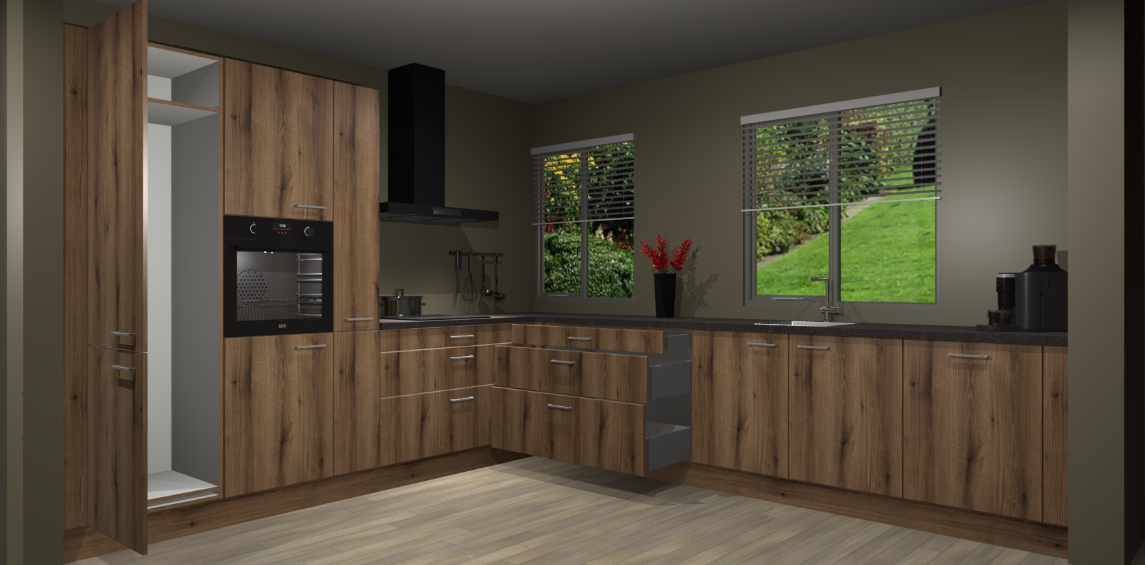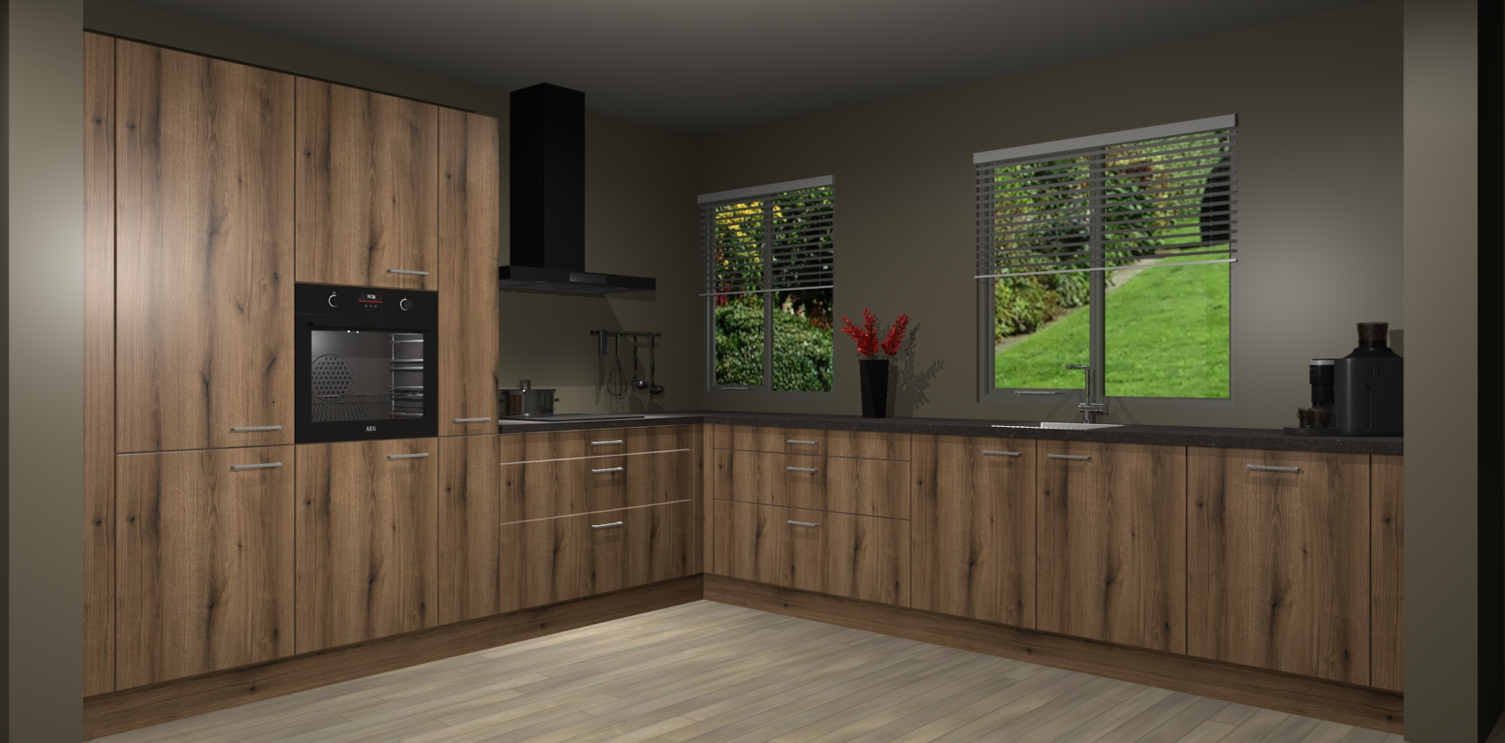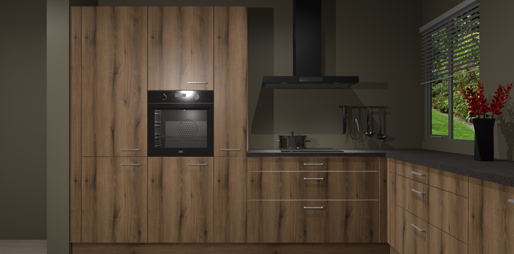 Welkom bij de Gouden Eiken keuken Palermo. Deze prachtige keuken zal de komende jaren het middelpunt van de belangstelling in uw huis zijn. Uitgerust met vijf inbouwapparaten komt u nooit kookgereedschap tekort. Bovendien geeft de warme houtlook elke ruimte een uitnodigende en tijdloze uitstraling.
