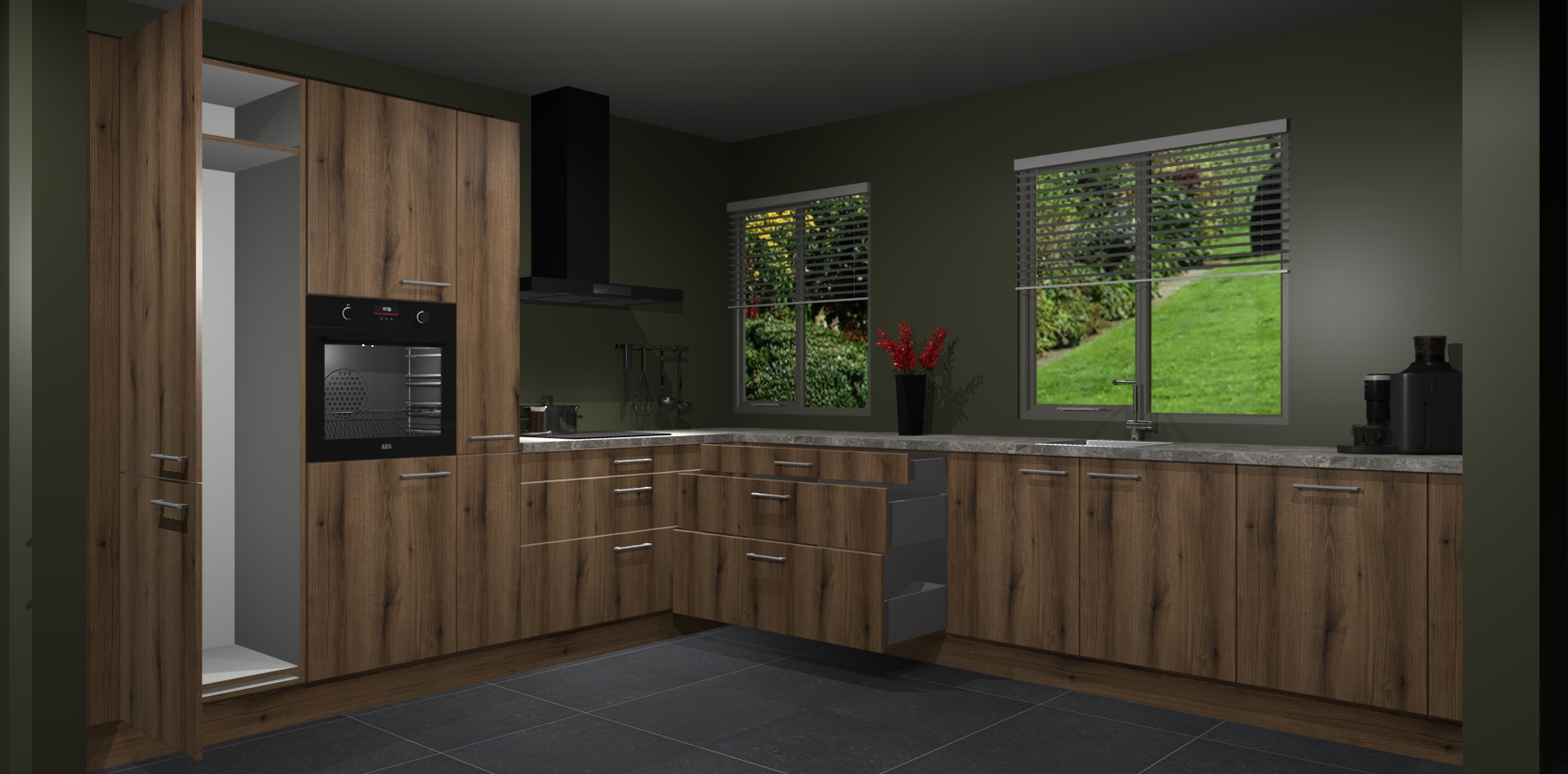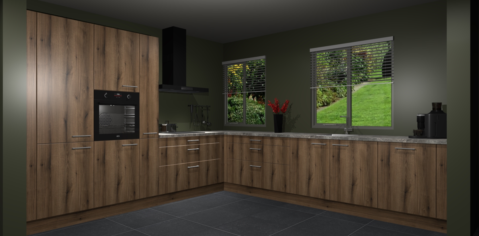 Welkom bij de Gouden Eiken keuken Palermo. Deze prachtige keuken zal de komende jaren het middelpunt van de belangstelling in uw huis zijn. Uitgerust met vijf inbouwapparaten komt u nooit kookgereedschap tekort. Bovendien geeft de warme houtlook elke ruimte een uitnodigende en tijdloze uitstraling.
