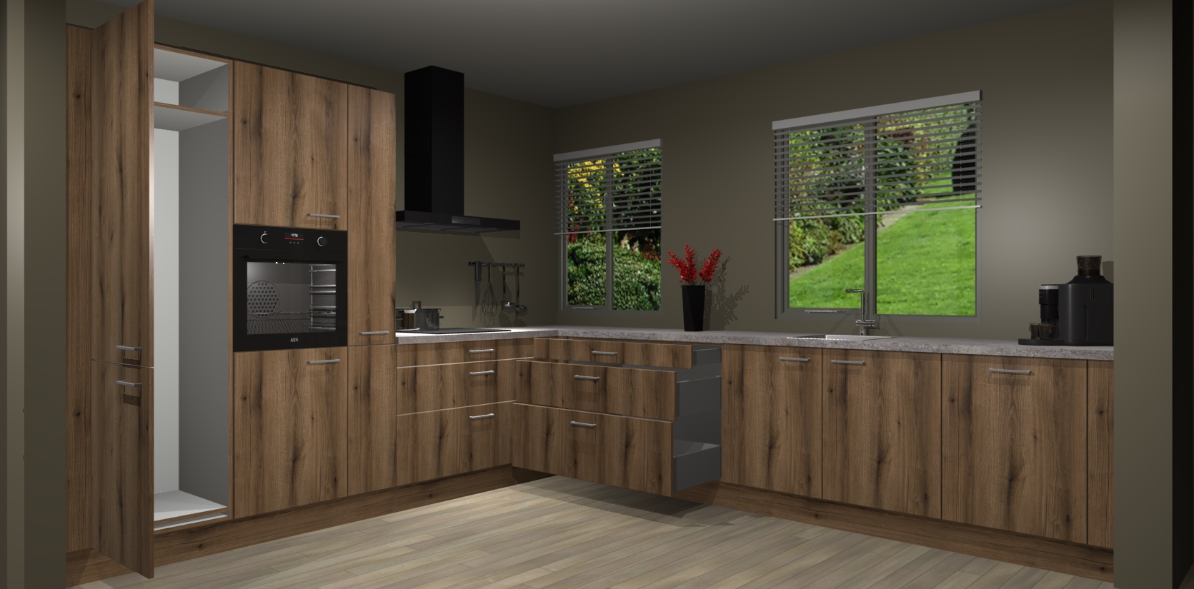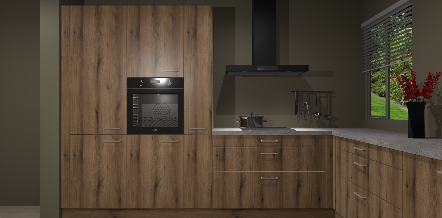 Welkom bij de Gouden Eiken keuken Palermo. Deze prachtige keuken zal de komende jaren het middelpunt van de belangstelling in uw huis zijn. Uitgerust met vijf inbouwapparaten komt u nooit kookgereedschap tekort. Bovendien geeft de warme houtlook elke ruimte een uitnodigende en tijdloze uitstraling.