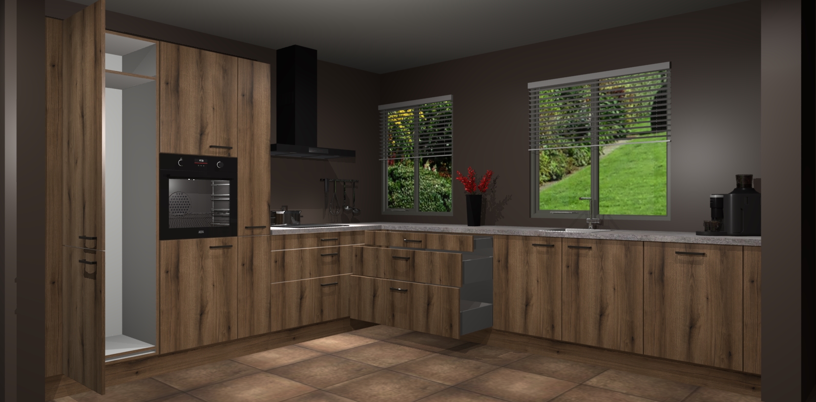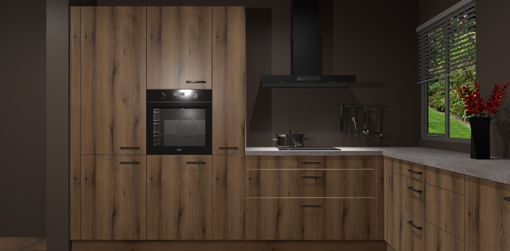 Welkom bij de Gouden Eiken keuken Palermo. Deze prachtige keuken zal de komende jaren het middelpunt van de belangstelling in uw huis zijn. Uitgerust met vijf inbouwapparaten komt u nooit kookgereedschap tekort. Bovendien geeft de warme houtlook elke ruimte een uitnodigende en tijdloze uitstraling.