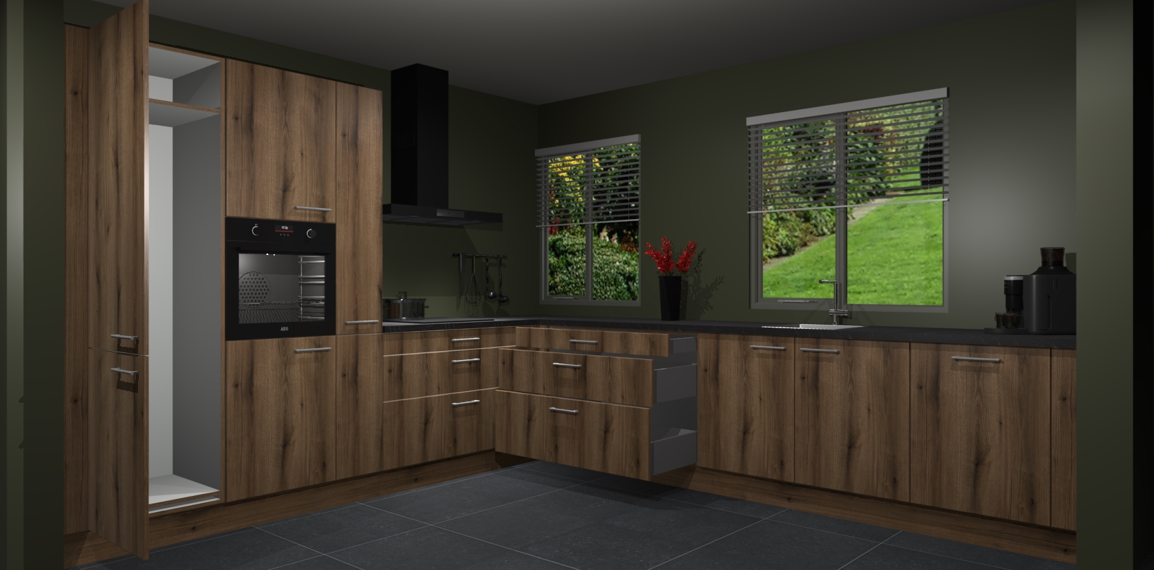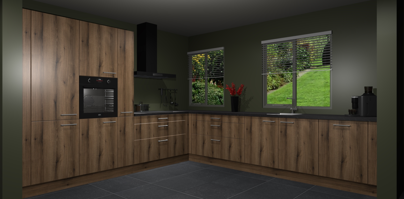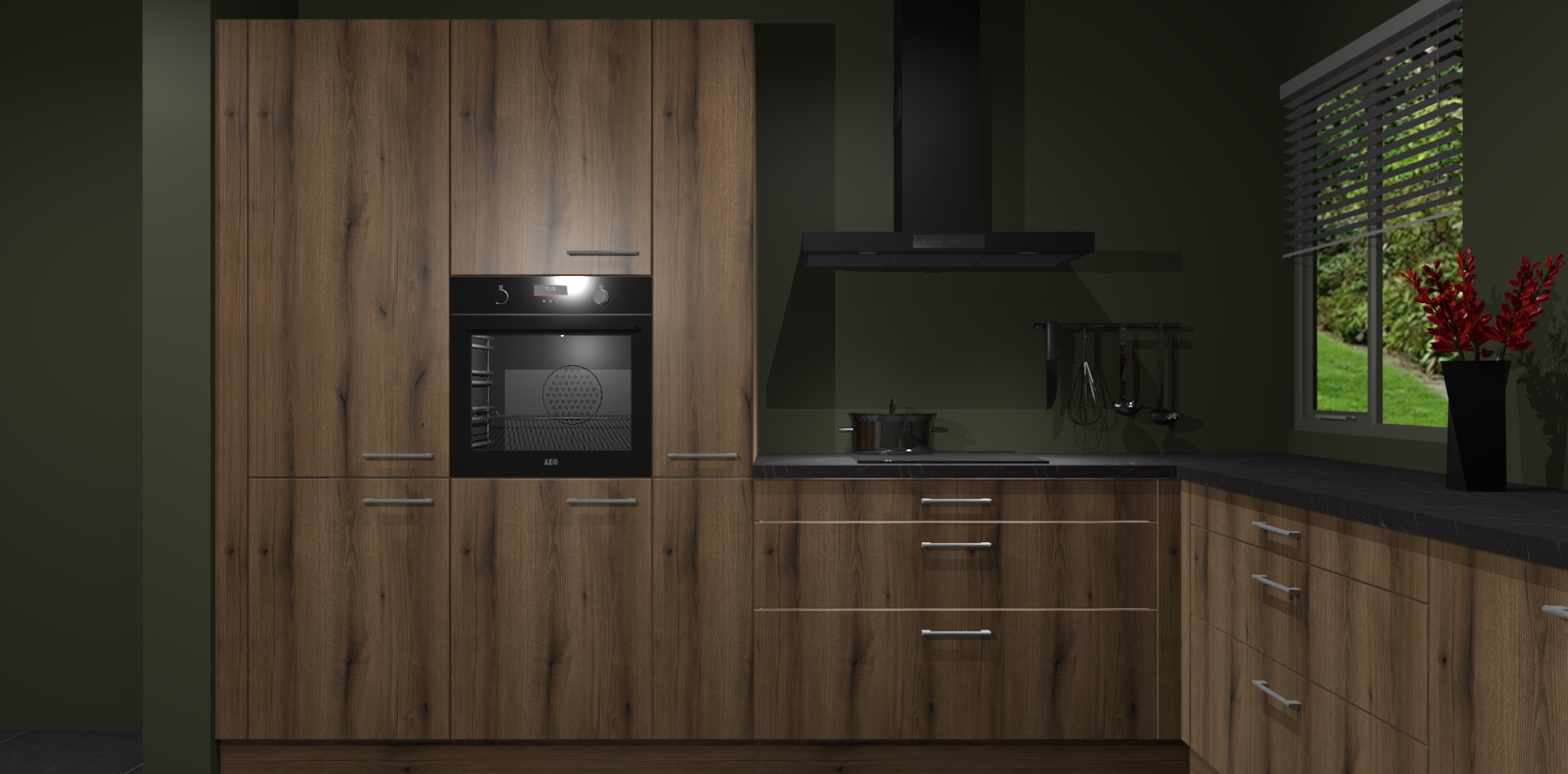 Welkom bij de Gouden Eiken keuken Palermo. Deze prachtige keuken zal de komende jaren het middelpunt van de belangstelling in uw huis zijn. Uitgerust met vijf inbouwapparaten komt u nooit kookgereedschap tekort. Bovendien geeft de warme houtlook elke ruimte een uitnodigende en tijdloze uitstraling.