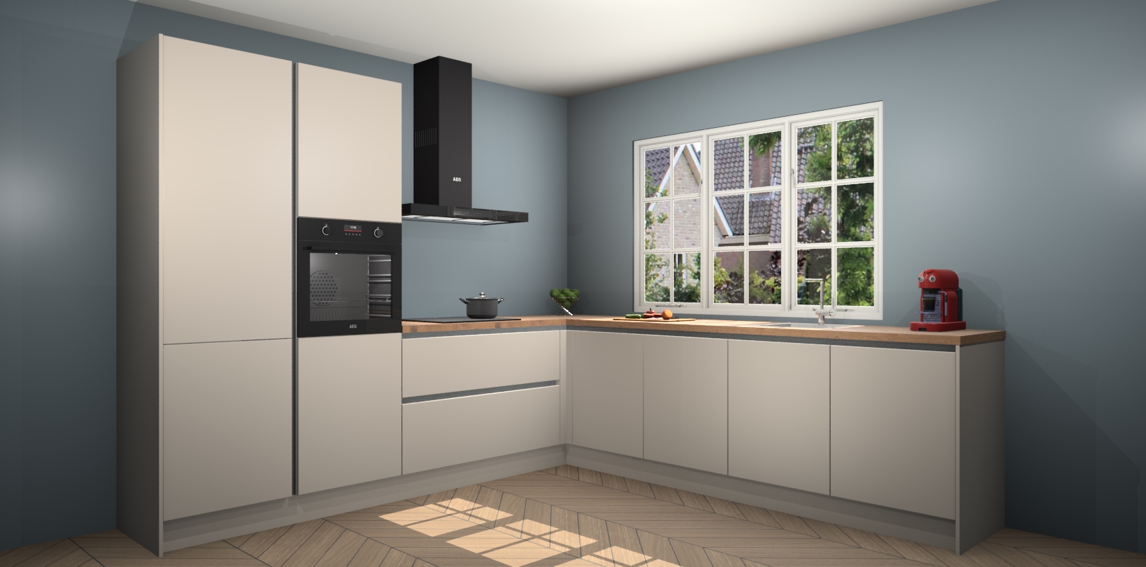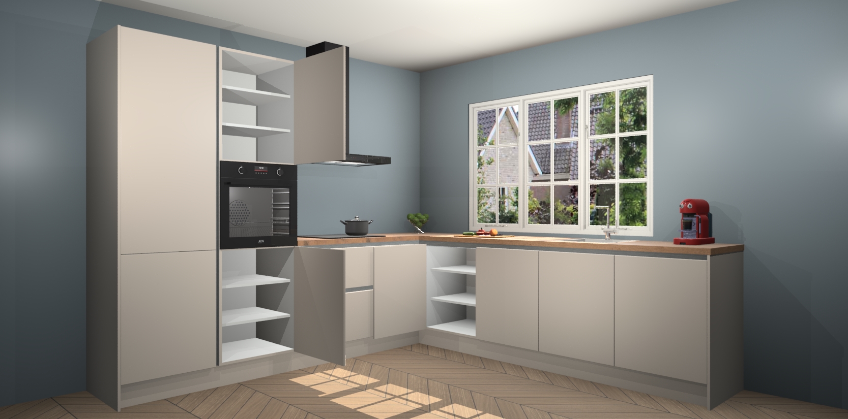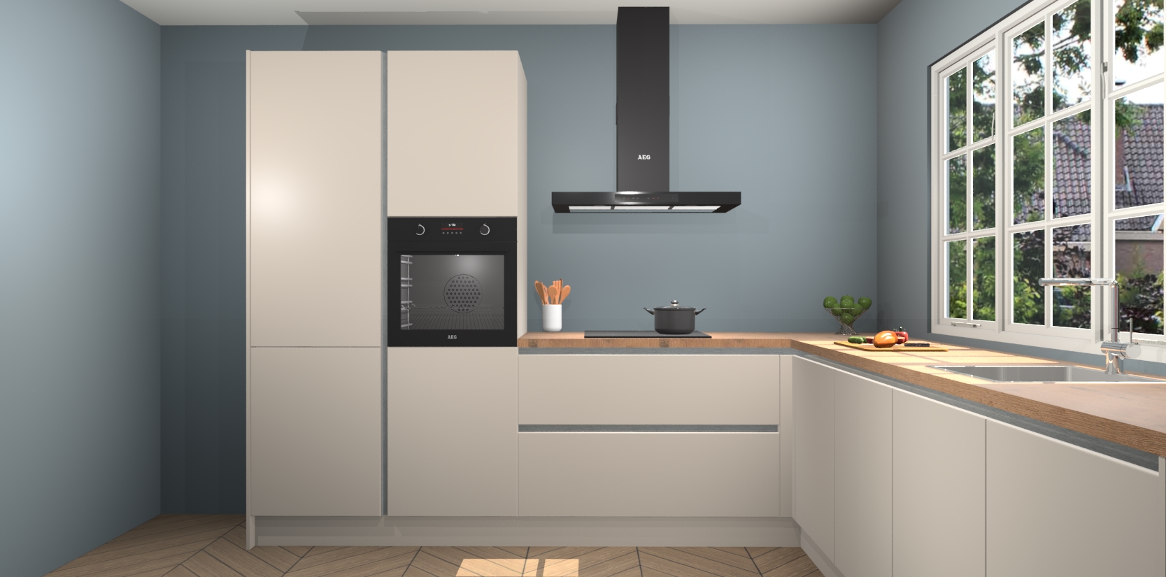 De keuken heeft veel opbergruimte, waardoor u alle ingrediënten gemakkelijk bereikbaar hebt staan. En daarnaast bevat deze volledig uitgeruste keuken ook 5 ingebouwde apparaten: een oven, inductiekookplaat, afzuigkap, vaatwasser en koelkast. Deze zijn heel eenvoudig na bestellen te upgraden naar AEG als u dit wilt. Bovendien zijn de softclose-kastdeuren ideaal; geef ze gewoon even een tikje en ze sluiten automatisch met geruisloze precisie.