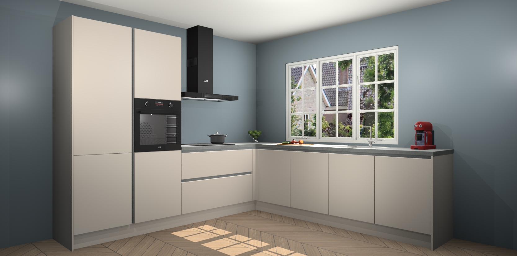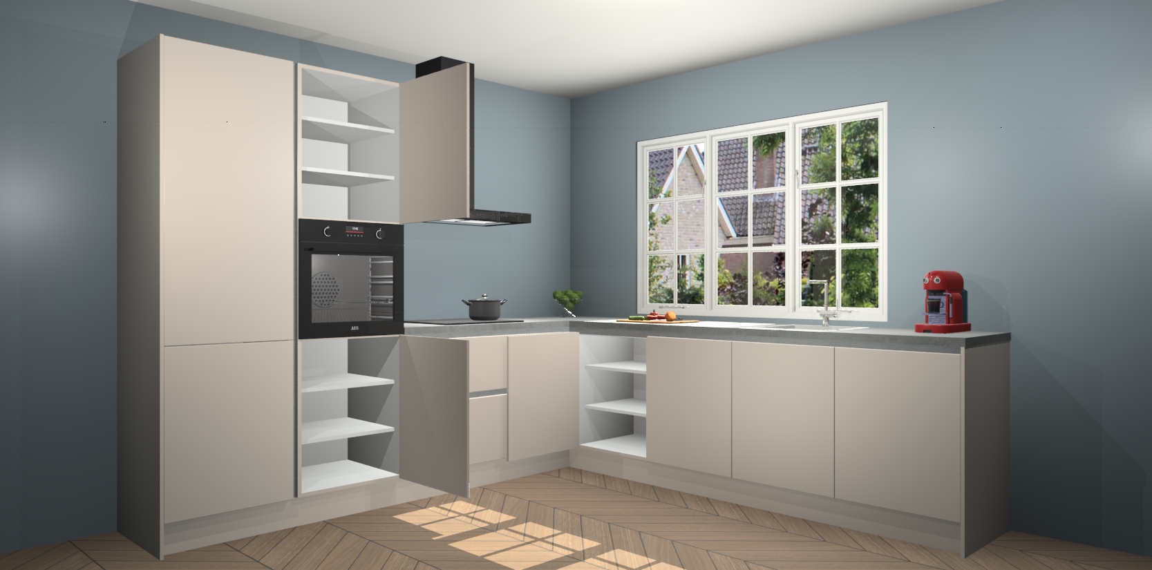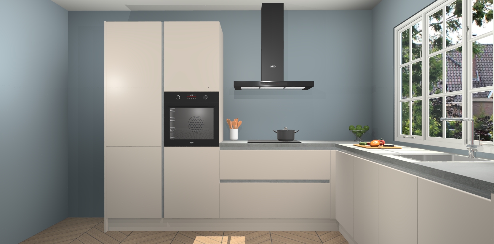 De keuken heeft veel opbergruimte, waardoor u alle ingrediënten gemakkelijk bereikbaar hebt staan. En daarnaast bevat deze volledig uitgeruste keuken ook 5 ingebouwde apparaten: een oven, inductiekookplaat, afzuigkap, vaatwasser en koelkast. Deze zijn heel eenvoudig na bestellen te upgraden naar AEG als u dit wilt. Bovendien zijn de softclose-kastdeuren ideaal; geef ze gewoon even een tikje en ze sluiten automatisch met geruisloze precisie.