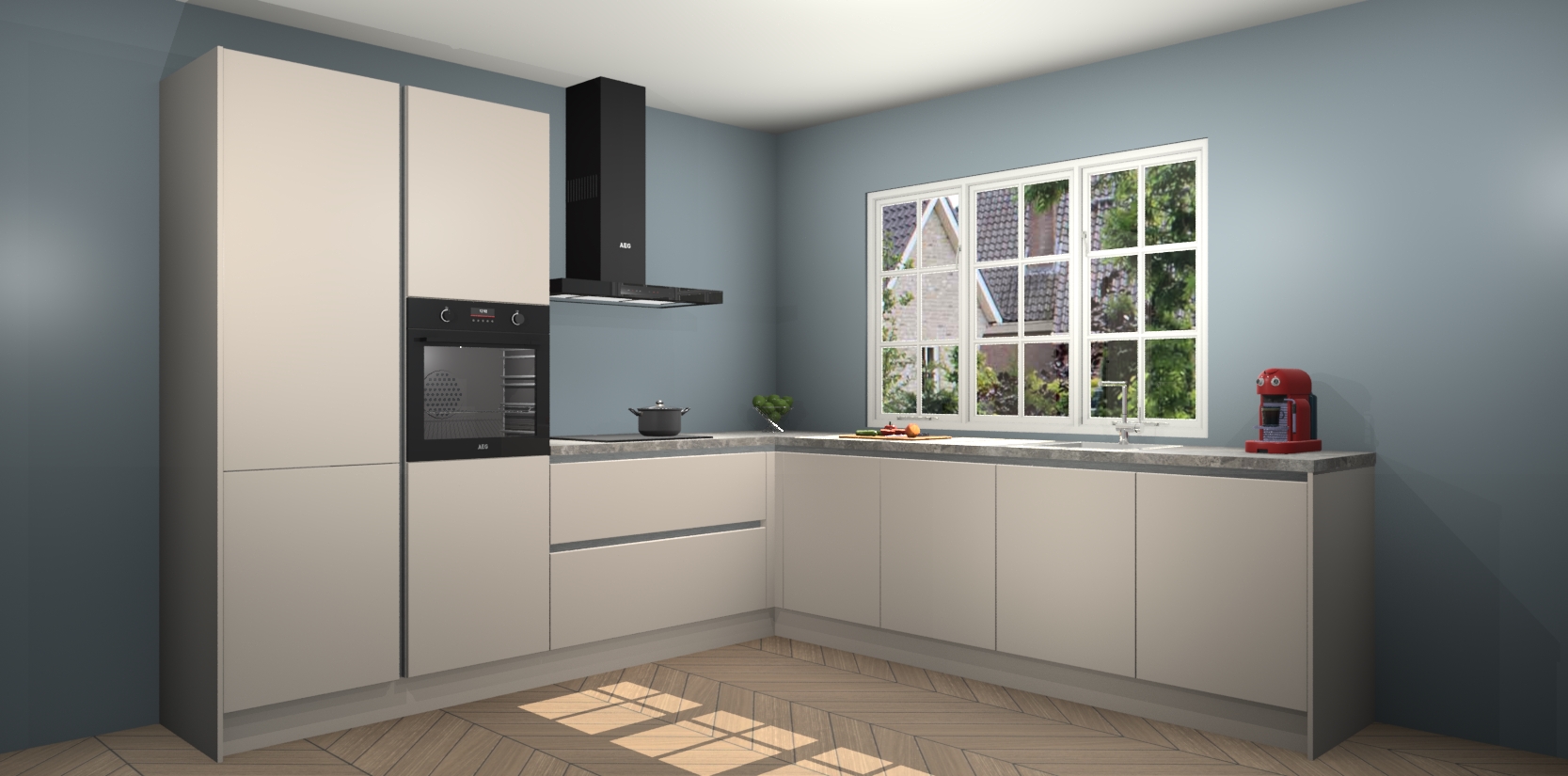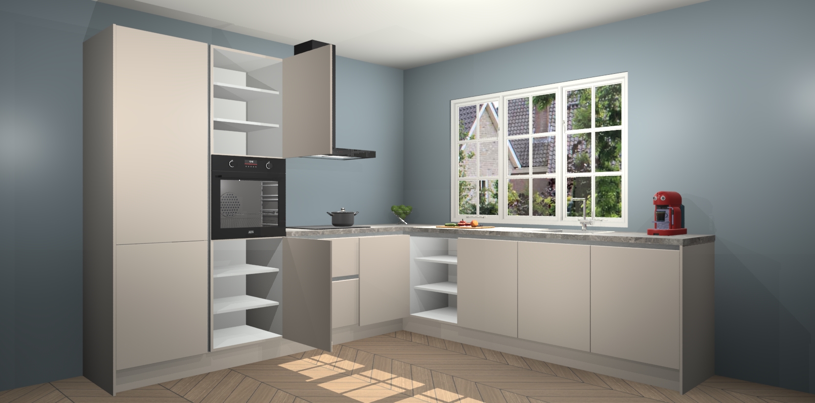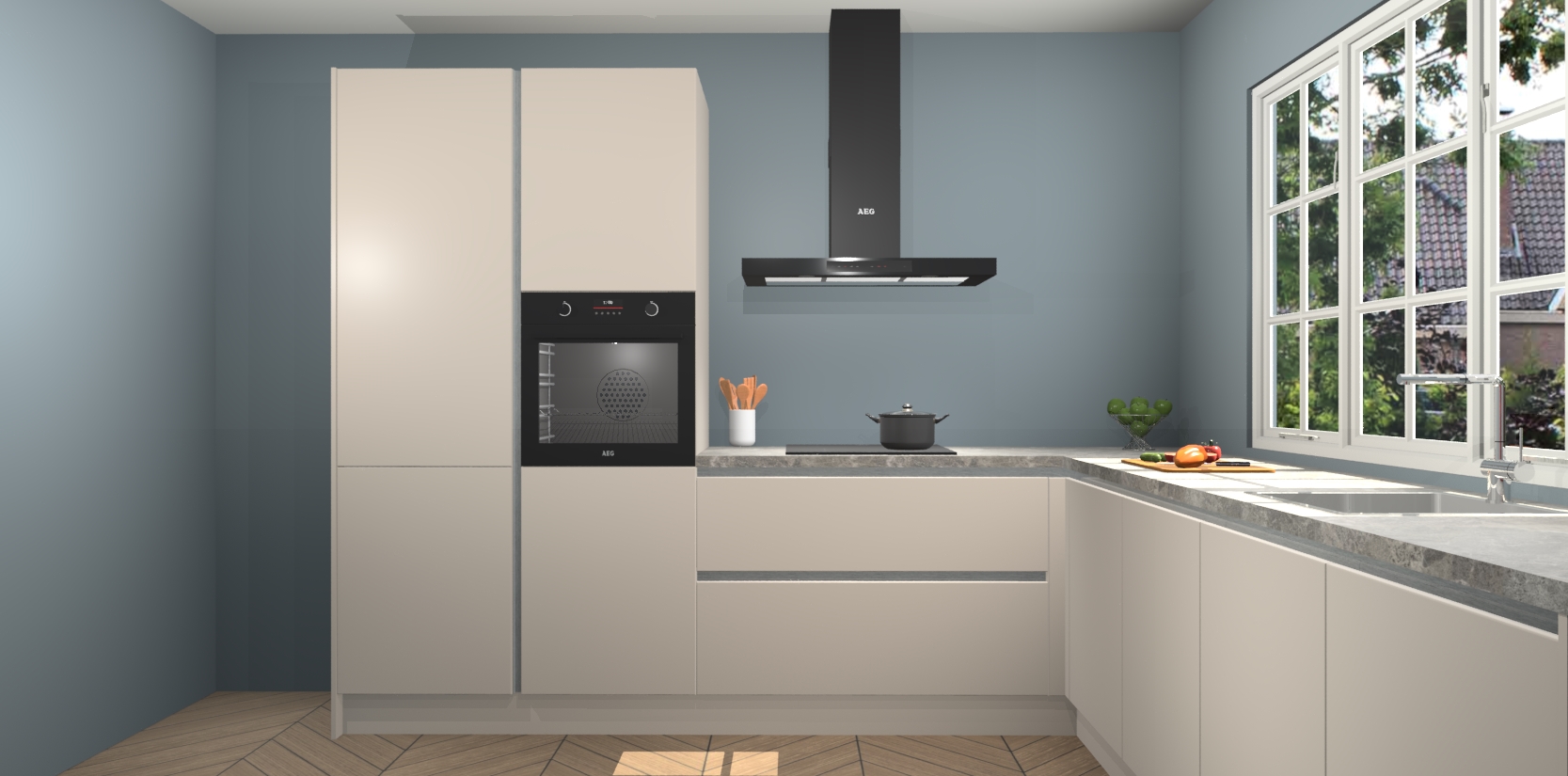 De keuken heeft veel opbergruimte, waardoor u alle ingrediënten gemakkelijk bereikbaar hebt staan. En daarnaast bevat deze volledig uitgeruste keuken ook 5 ingebouwde apparaten: een oven, inductiekookplaat, afzuigkap, vaatwasser en koelkast. Deze zijn heel eenvoudig na bestellen te upgraden naar AEG als u dit wilt. Bovendien zijn de softclose-kastdeuren ideaal; geef ze gewoon even een tikje en ze sluiten automatisch met geruisloze precisie.