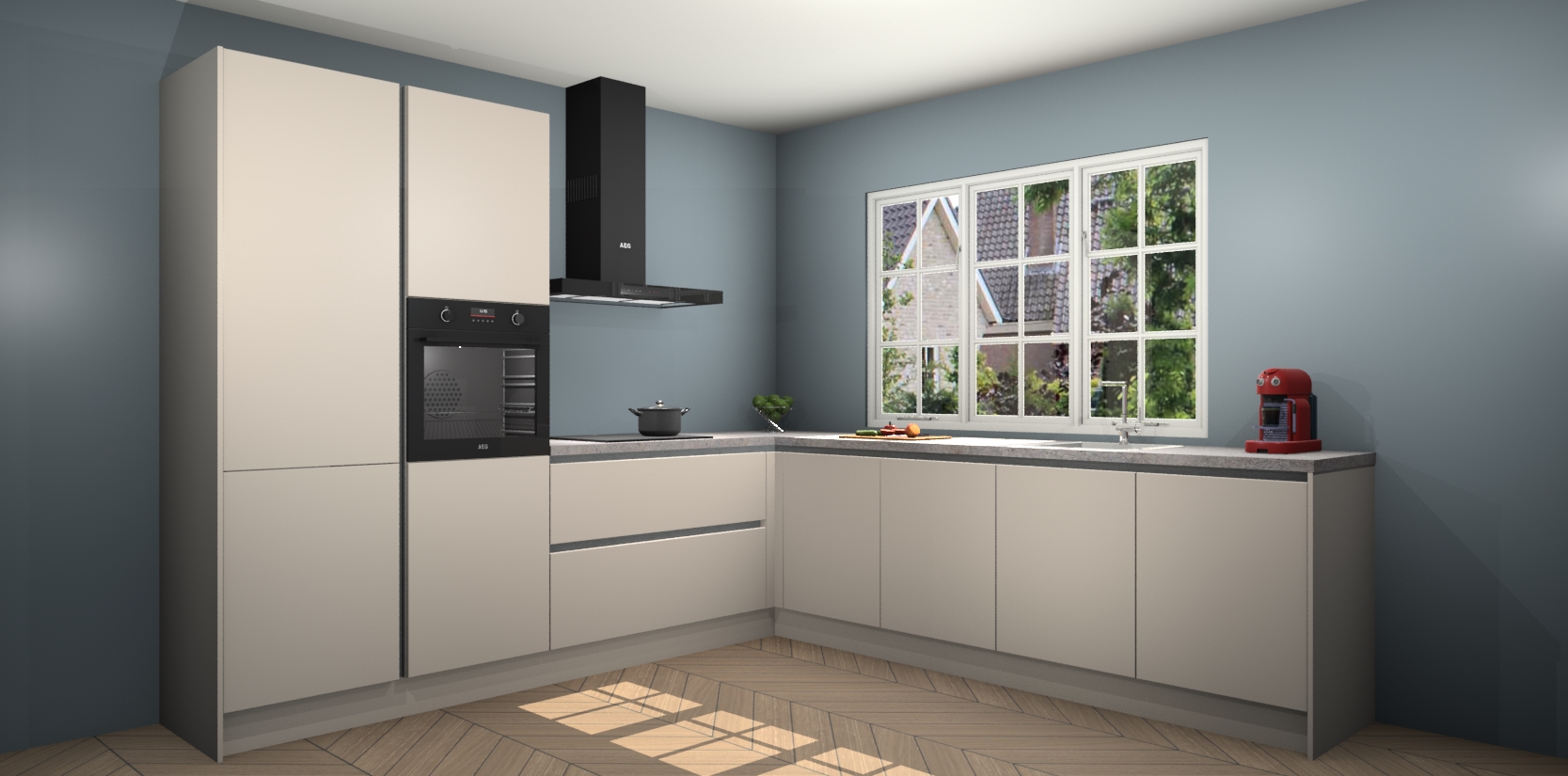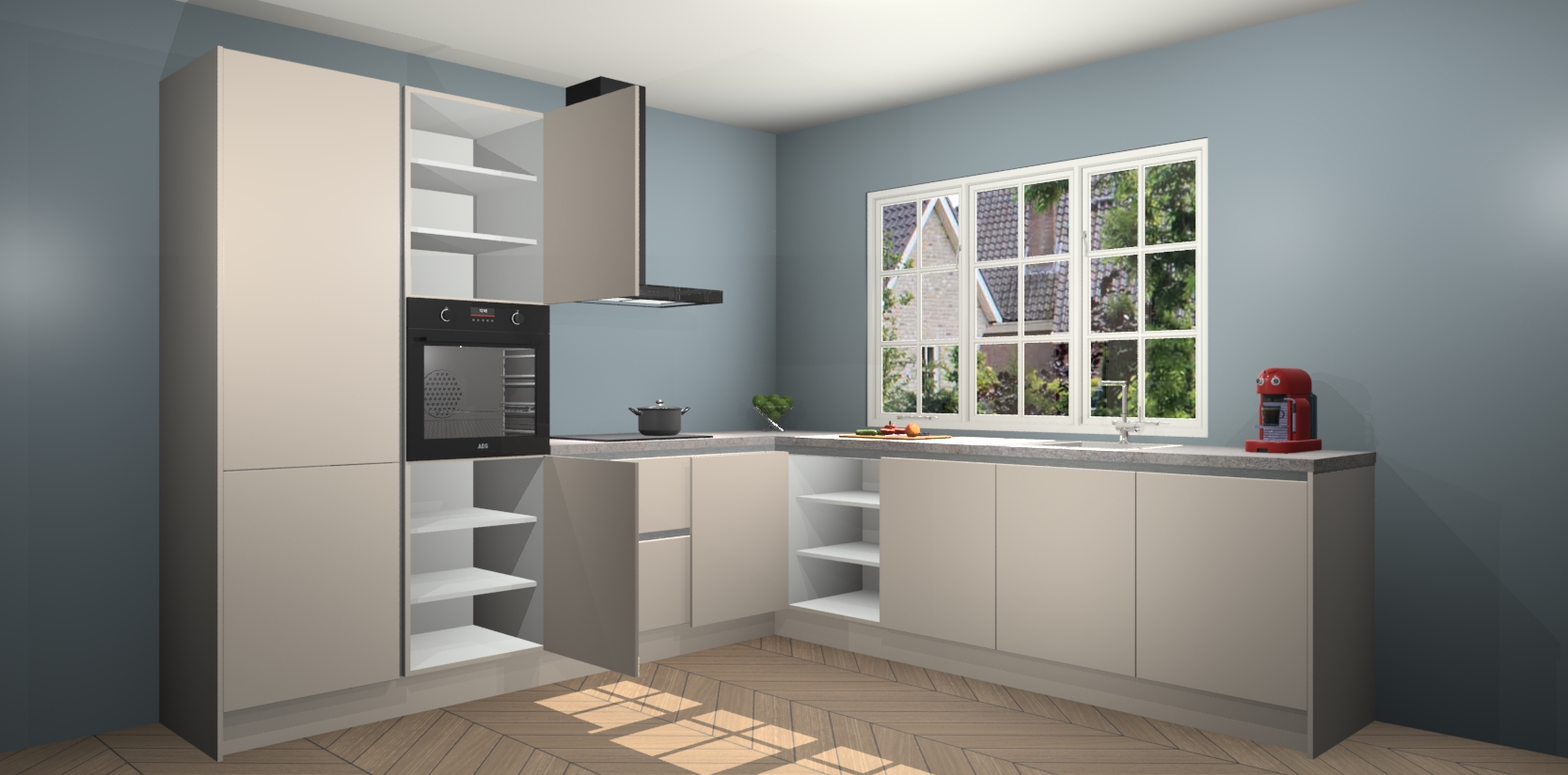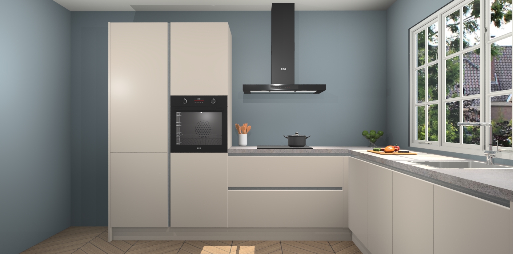 De keuken heeft veel opbergruimte, waardoor u alle ingrediënten gemakkelijk bereikbaar hebt staan. En daarnaast bevat deze volledig uitgeruste keuken ook 5 ingebouwde apparaten: een oven, inductiekookplaat, afzuigkap, vaatwasser en koelkast. Deze zijn heel eenvoudig na bestellen te upgraden naar AEG als u dit wilt. Bovendien zijn de softclose-kastdeuren ideaal; geef ze gewoon even een tikje en ze sluiten automatisch met geruisloze precisie.