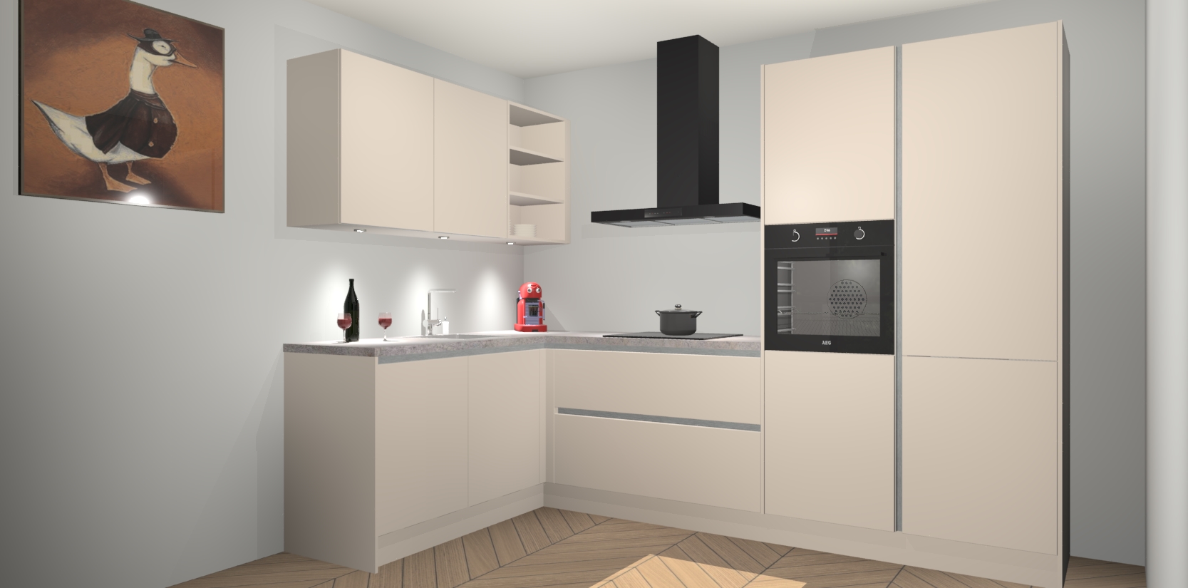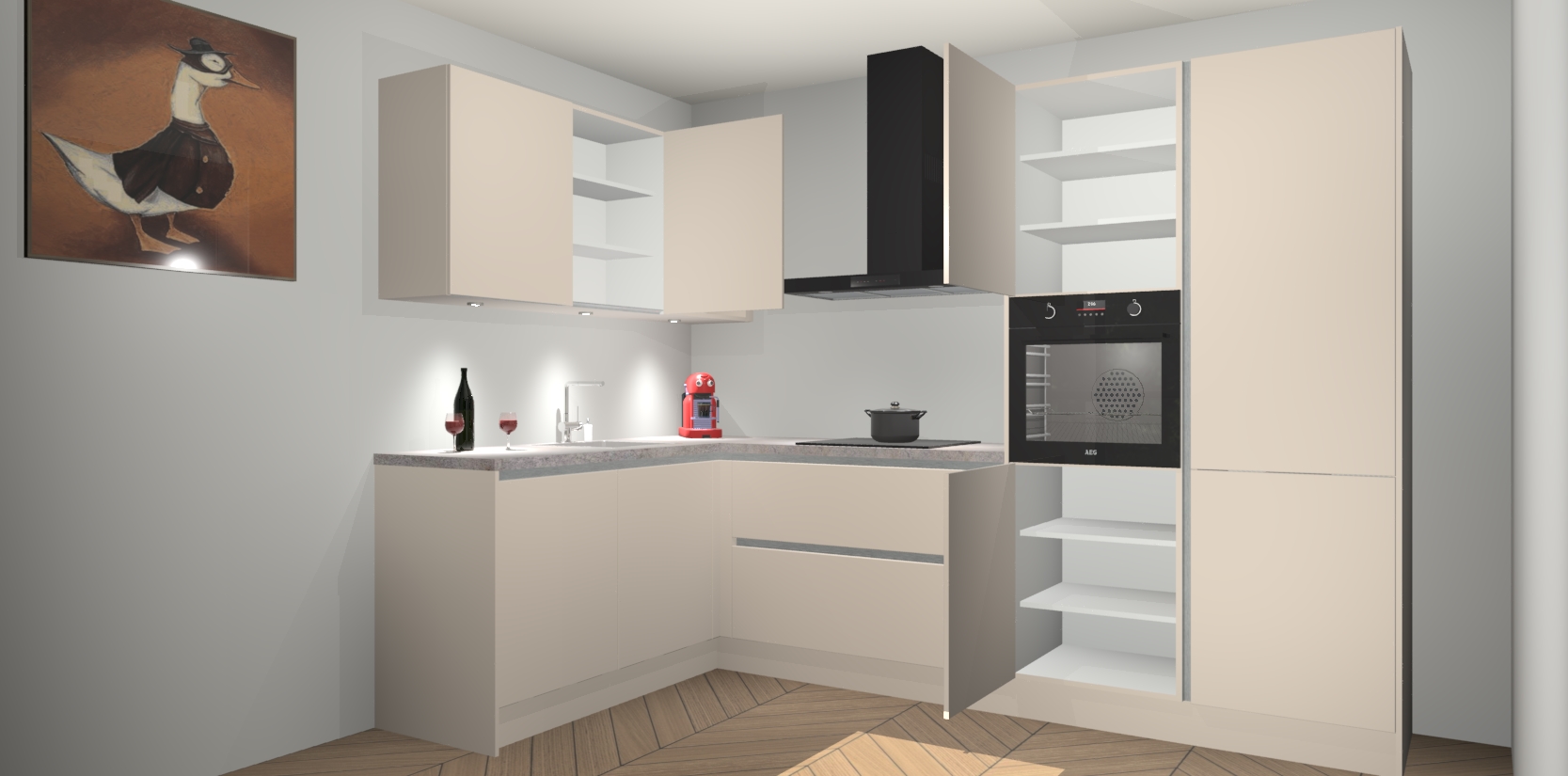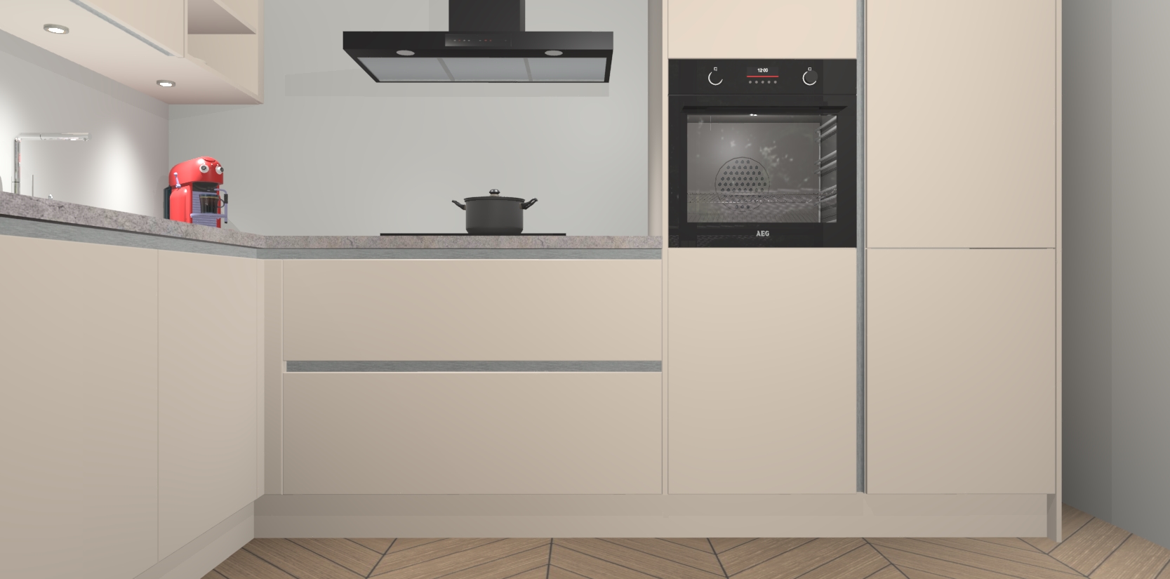 De kasjmier greeploze keuken Cognac is een adembenemend ontwerp met een modern en tijdloos uiterlijk. Deze luxe keuken straalt echt aristocratisch uit, waardoor uw koken plezieriger zal worden! Het prachtige design begint bij de hoekkeuken, wat perfect past bij elk type interieur. Bovendien bevat deze hoogwaardige set vijf inbouwapparaten - van oven tot koelkast - die via bestelling naar AEG geüpgraded kunnen worden!