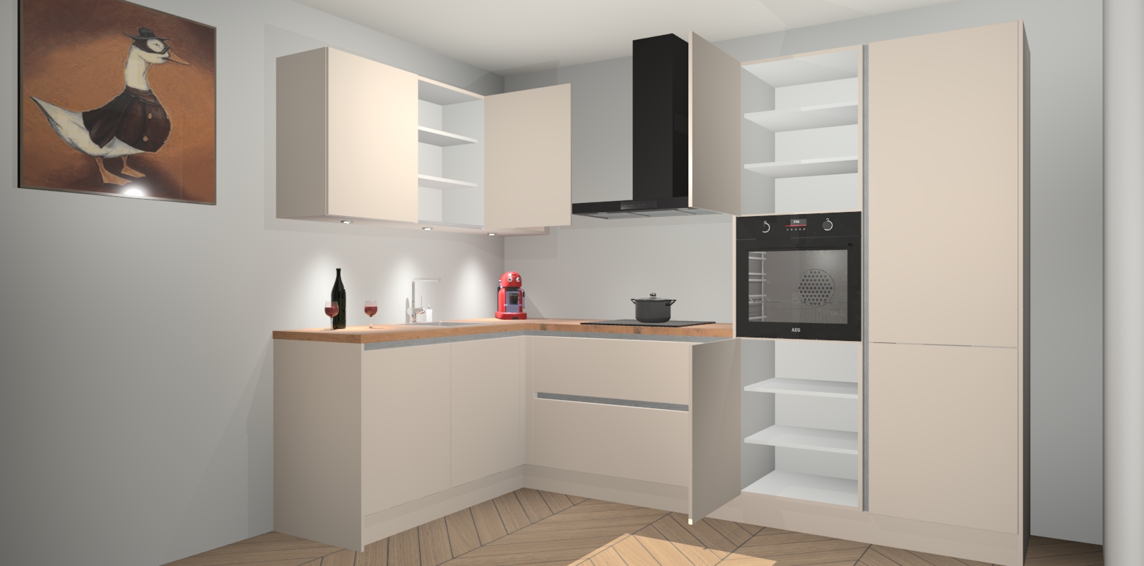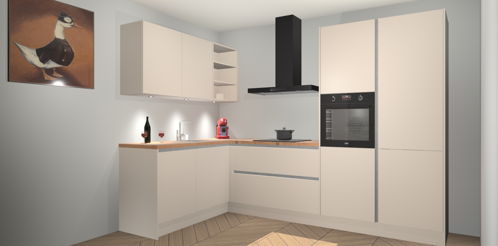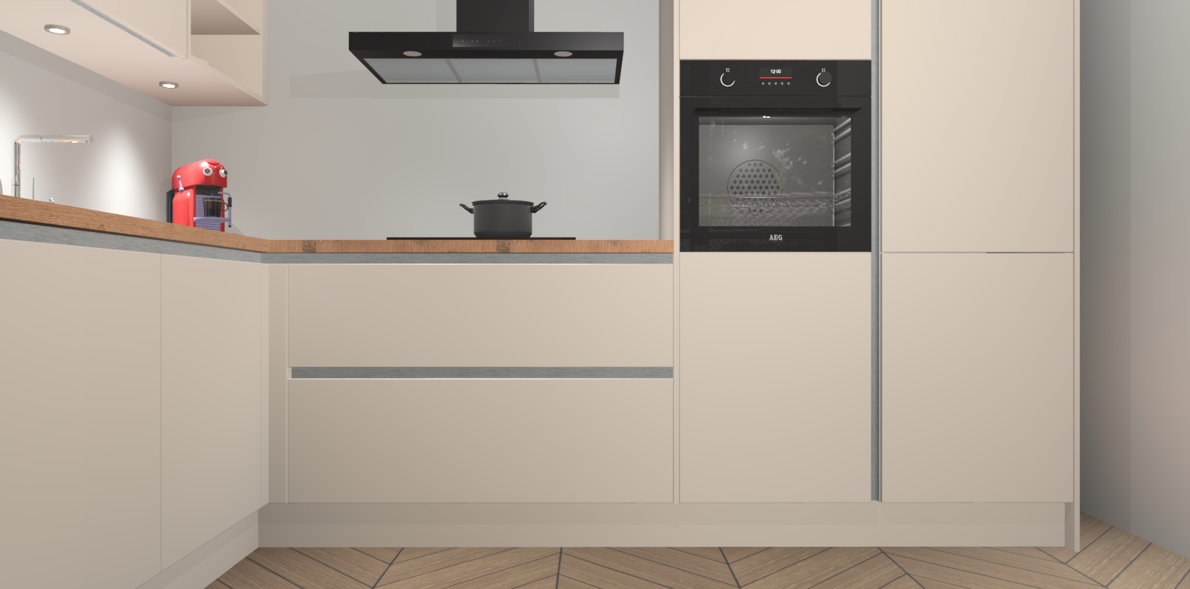 De kasjmier greeploze keuken Cognac is een adembenemend ontwerp met een modern en tijdloos uiterlijk. Deze luxe keuken straalt echt aristocratisch uit, waardoor uw koken plezieriger zal worden! Het prachtige design begint bij de hoekkeuken, wat perfect past bij elk type interieur. Bovendien bevat deze hoogwaardige set vijf inbouwapparaten - van oven tot koelkast - die via bestelling naar AEG geüpgraded kunnen worden!