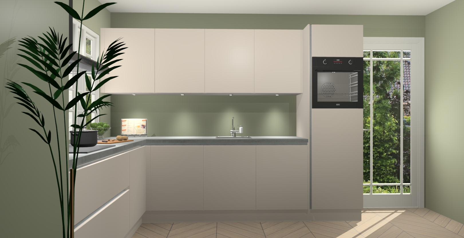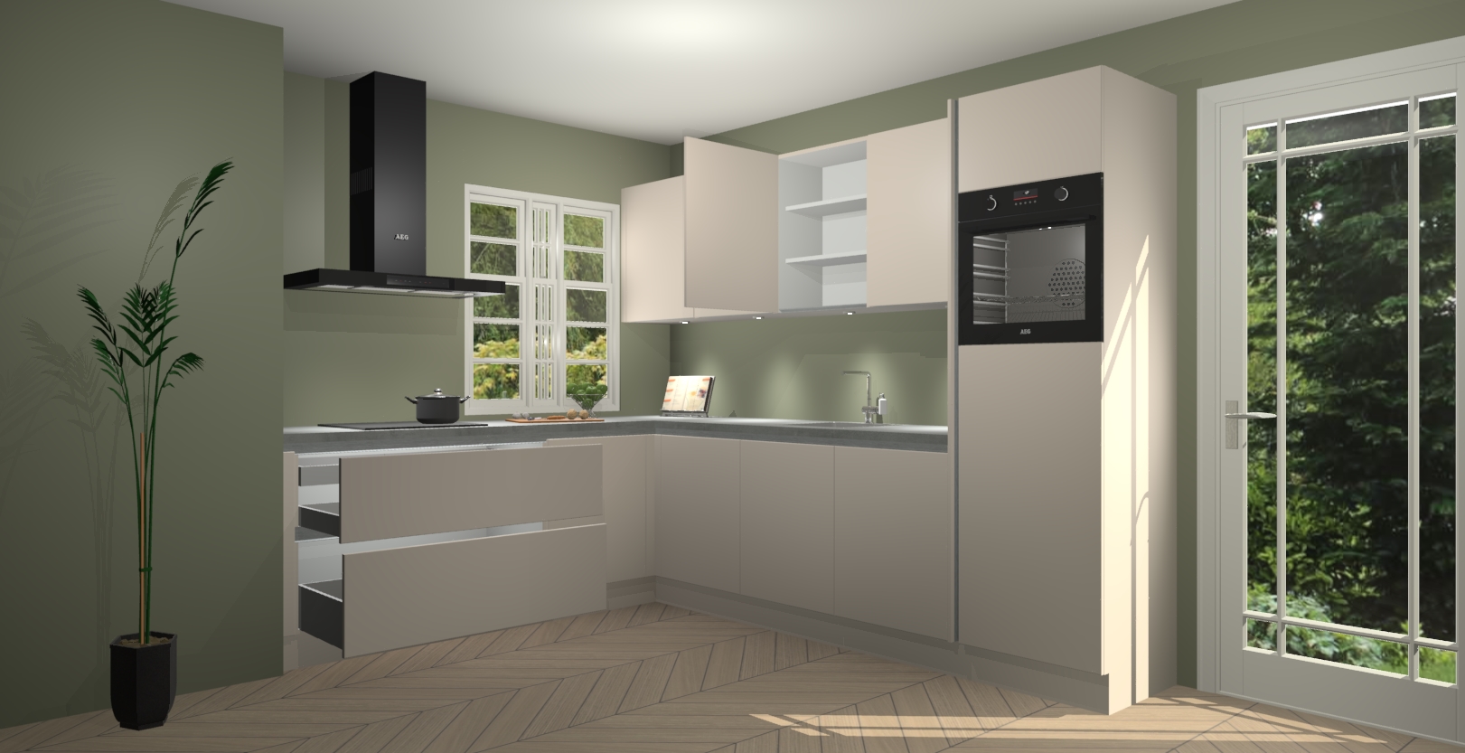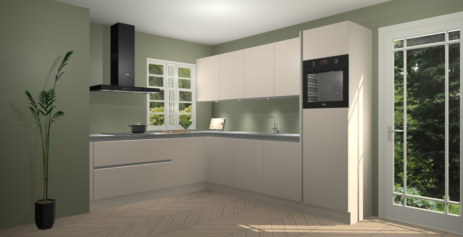 Met een modern, tijdloos design en ruime opslagruimte, zult u zich in no-time thuis voelen in uw nieuwe keuken. Uw leven wordt eenvoudiger met de soft-close deuren die voor het ultieme stille comfort zorgen - geen geluid dat u stoort terwijl u kookt. Ook is de keuken voorzien van 5 ingebouwde apparaten: een oven, inductie kookplaat, afzuigkap, vaatwasser en koelkast. Deze kunnen gemakkelijk na bestelling worden bijgewerkt naar AEG - waardoor uw luxe ervaring compleet is.