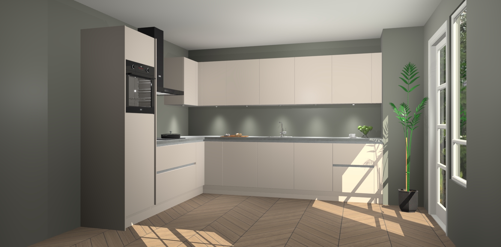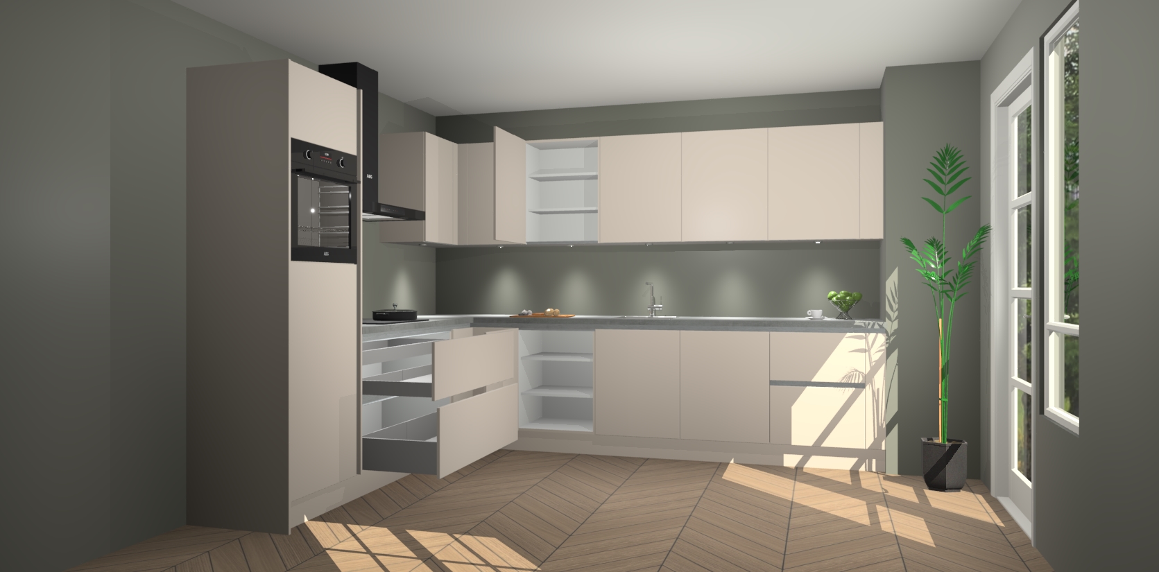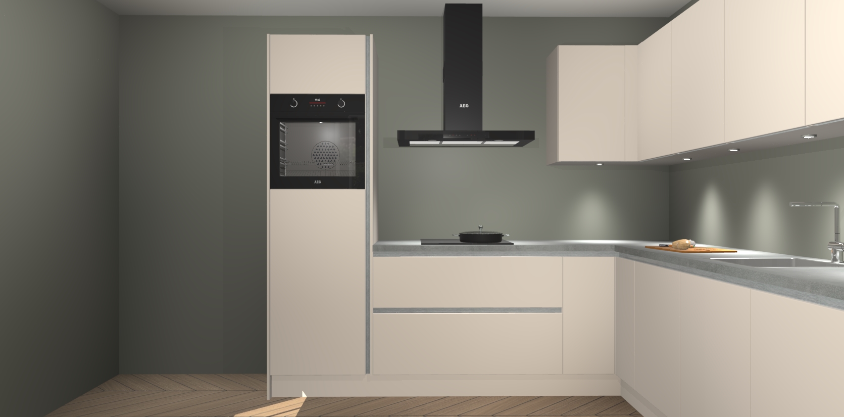 De Kasjmier greeploze keuken Debar is uitgerust met vijf inbouwapparaten die elke kooktaak handig en efficiënt maken. Een oven, inductiekookplaat, afzuigkap, vaatwasser en koelkast zijn standaard, maar kunnen na bestelling eenvoudig worden geupgrade naar AEG. Profiteer vervolgens van de softclose deuren voor snelle toegang en geruisloze toegang.