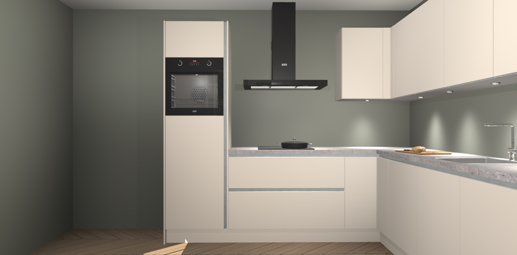 De Kasjmier greeploze keuken Debar is uitgerust met vijf inbouwapparaten die elke kooktaak handig en efficiënt maken. Een oven, inductiekookplaat, afzuigkap, vaatwasser en koelkast zijn standaard, maar kunnen na bestelling eenvoudig worden geupgrade naar AEG. Profiteer vervolgens van de softclose deuren voor snelle toegang en geruisloze toegang.