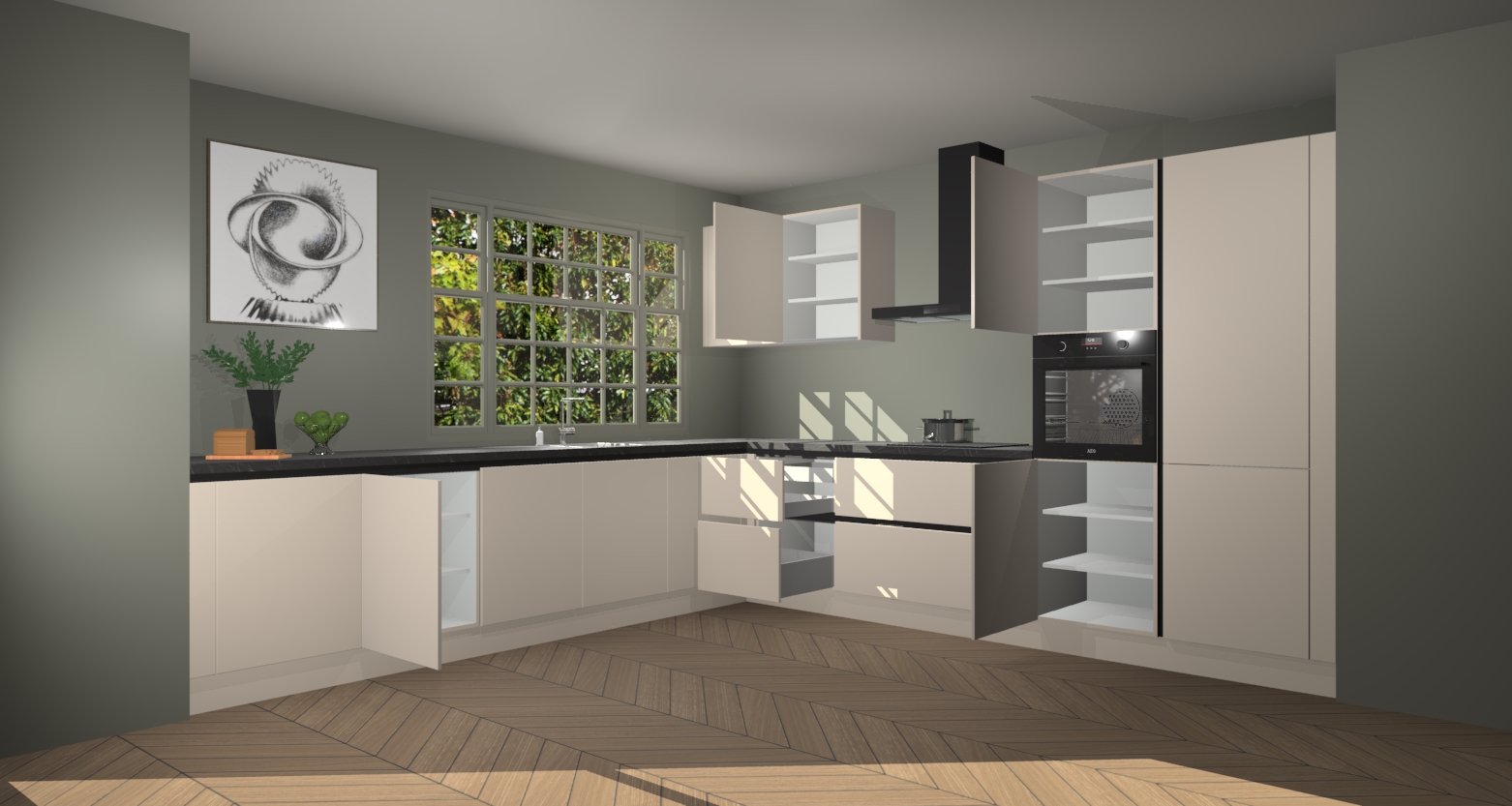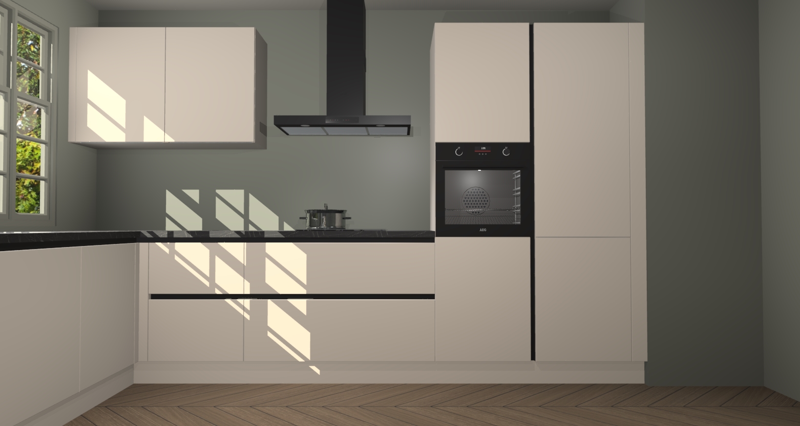 Met een modern, tijdloos design en ruime opslagruimte, zult u zich in no-time thuis voelen in uw nieuwe keuken. Uw leven wordt eenvoudiger met de soft-close deuren die voor het ultieme stille comfort zorgen - geen geluid dat u stoort terwijl u kookt. Ook is de keuken voorzien van 5 ingebouwde apparaten: een oven, inductie kookplaat, afzuigkap, vaatwasser en koelkast. Deze kunnen gemakkelijk na bestelling worden bijgewerkt naar AEG - waardoor uw luxe ervaring compleet is.