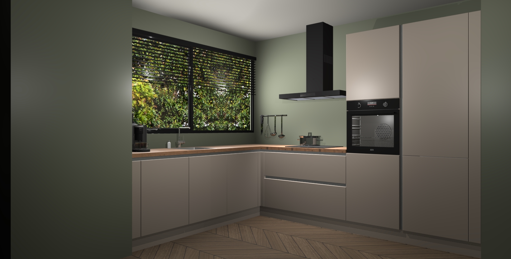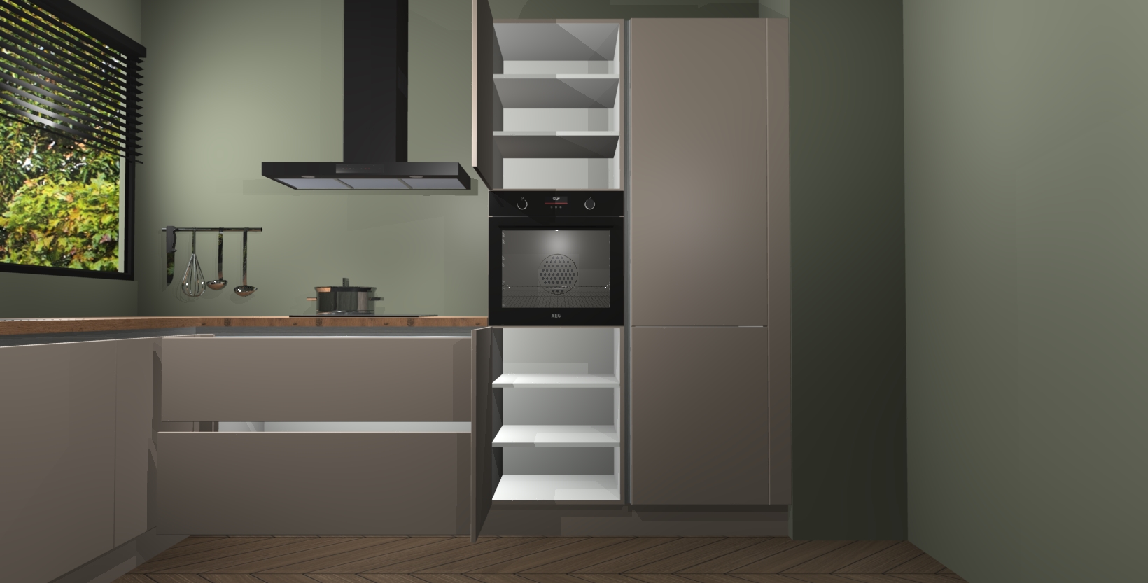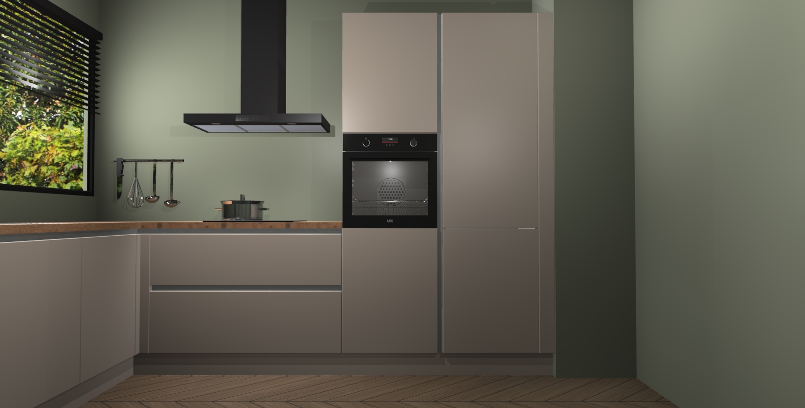 Met een modern, tijdloos design en ruime opslagruimte, zult u zich in no-time thuis voelen in uw nieuwe keuken. Uw leven wordt eenvoudiger met de soft-close deuren die voor het ultieme stille comfort zorgen - geen geluid dat u stoort terwijl u kookt. Ook is de keuken voorzien van 5 ingebouwde apparaten: een oven, inductie kookplaat, afzuigkap, vaatwasser en koelkast. Deze kunnen gemakkelijk na bestelling worden bijgewerkt naar AEG - waardoor uw luxe ervaring compleet is.