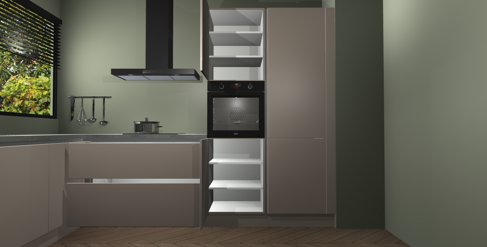 Met een modern, tijdloos design en ruime opslagruimte, zult u zich in no-time thuis voelen in uw nieuwe keuken. Uw leven wordt eenvoudiger met de soft-close deuren die voor het ultieme stille comfort zorgen - geen geluid dat u stoort terwijl u kookt. Ook is de keuken voorzien van 5 ingebouwde apparaten: een oven, inductie kookplaat, afzuigkap, vaatwasser en koelkast. Deze kunnen gemakkelijk na bestelling worden bijgewerkt naar AEG - waardoor uw luxe ervaring compleet is.