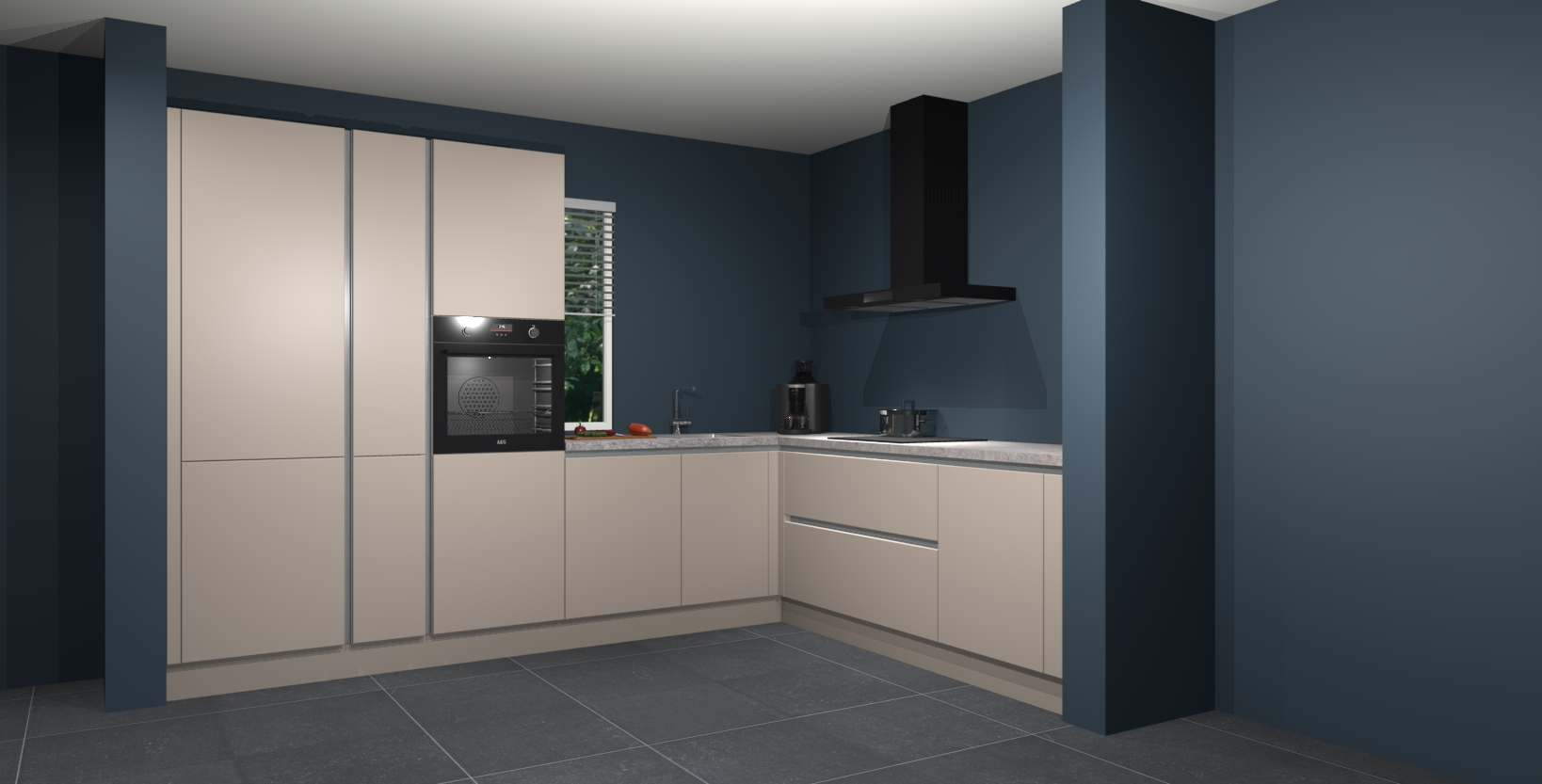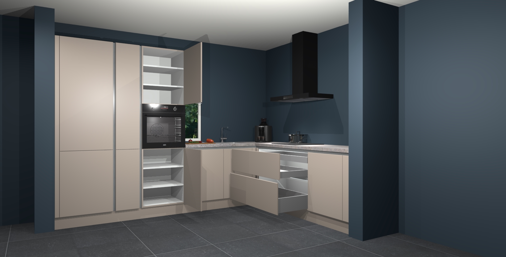 Met een modern, tijdloos design en ruime opslagruimte, zult u zich in no-time thuis voelen in uw nieuwe keuken. Uw leven wordt eenvoudiger met de soft-close deuren die voor het ultieme stille comfort zorgen - geen geluid dat u stoort terwijl u kookt. Ook is de keuken voorzien van 5 ingebouwde apparaten: een oven, inductie kookplaat, afzuigkap, vaatwasser en koelkast. Deze kunnen gemakkelijk na bestelling worden bijgewerkt naar AEG - waardoor uw luxe ervaring compleet is.